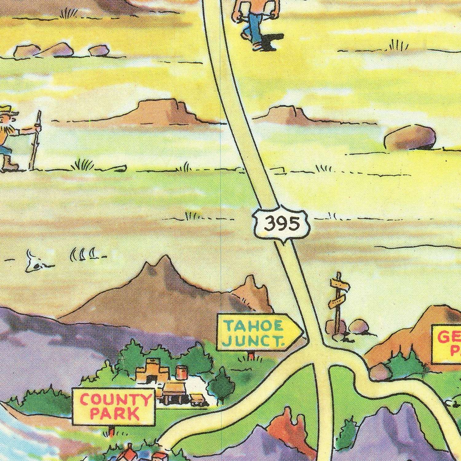 For collectors, the pedigree is impeccable. Bloodgood’s career—stretching back to his 1935 California Pacific Exposition map—brought a storyteller’s wit and an illustrator’s discipline to American pictorial cartography. Here, his hand animates every detail: the elegant cartouche, directional banners, and key information boxes that distill events and logistics; the lyrical rendering of peaks and pines; the convivial scenes that humanize geography. More than a guide to a fortnight of competition, this is a keepsake of a region and an era—where Lake Tahoe’s brilliance, Sierra routes, and Olympic lore converge. As the only obtainable pictorial testament to the 1960 Games, it is both historic document and enduring work of art.