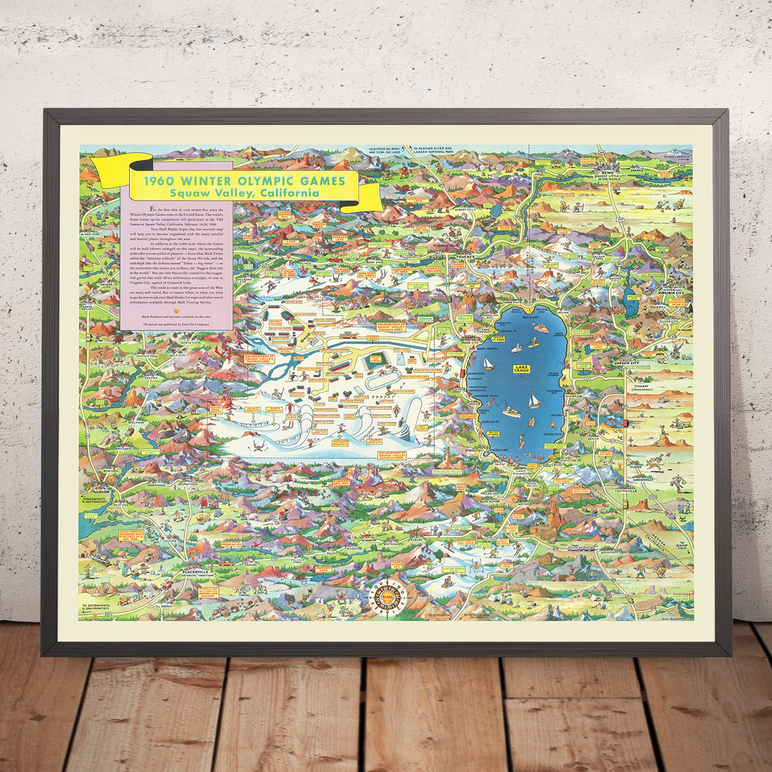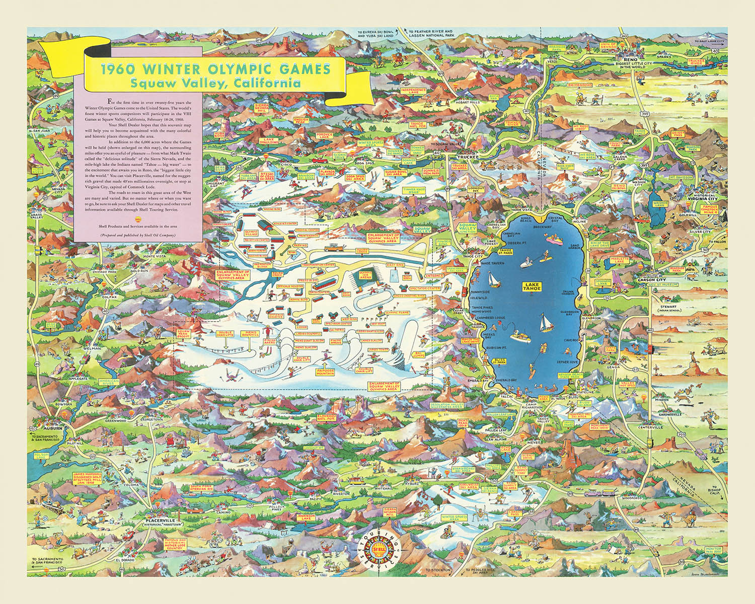 Don Bloodgood’s 1960 Winter Olympic Games Squaw Valley, California is a jubilant fusion of art, athletics, and mid-century travel culture. Issued by Shell Oil Company as a spirited visitor’s guide to the Games, it marries practical orientation with Bloodgood’s signature whimsy—vivid colors, lively characters, and a richly detailed hand. A decorative cartouche and crisp compass rose introduce the tableau, while banners and playful arrows draw the eye across the Sierra. As the only obtainable pictorial map devoted to the 1960 Winter Olympics, it captures a singular cultural moment: the West Coast’s alpine stage welcoming the world, and America’s car-borne spectators navigating a new era of leisure, sport, and scenic exploration.