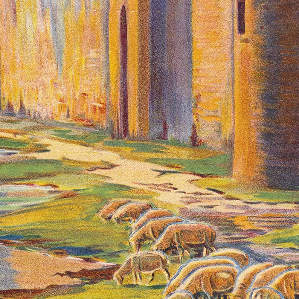 Color and design: Couronneau balances warm ochres and yellows against cool greens and soft blue notes to create a serene, sun‑washed atmosphere. Strong verticals of the crenellated walls anchor the scene, while horizontal bands of river and sky open the composition and add depth. The presence of a shepherd with a small flock introduces a pastoral counterpoint to the monumental stonework—an elegant nod to rural life that softens the geometry and enriches the narrative. The result is an image that reads beautifully from across a room yet rewards close viewing with fine, deliberate linework.