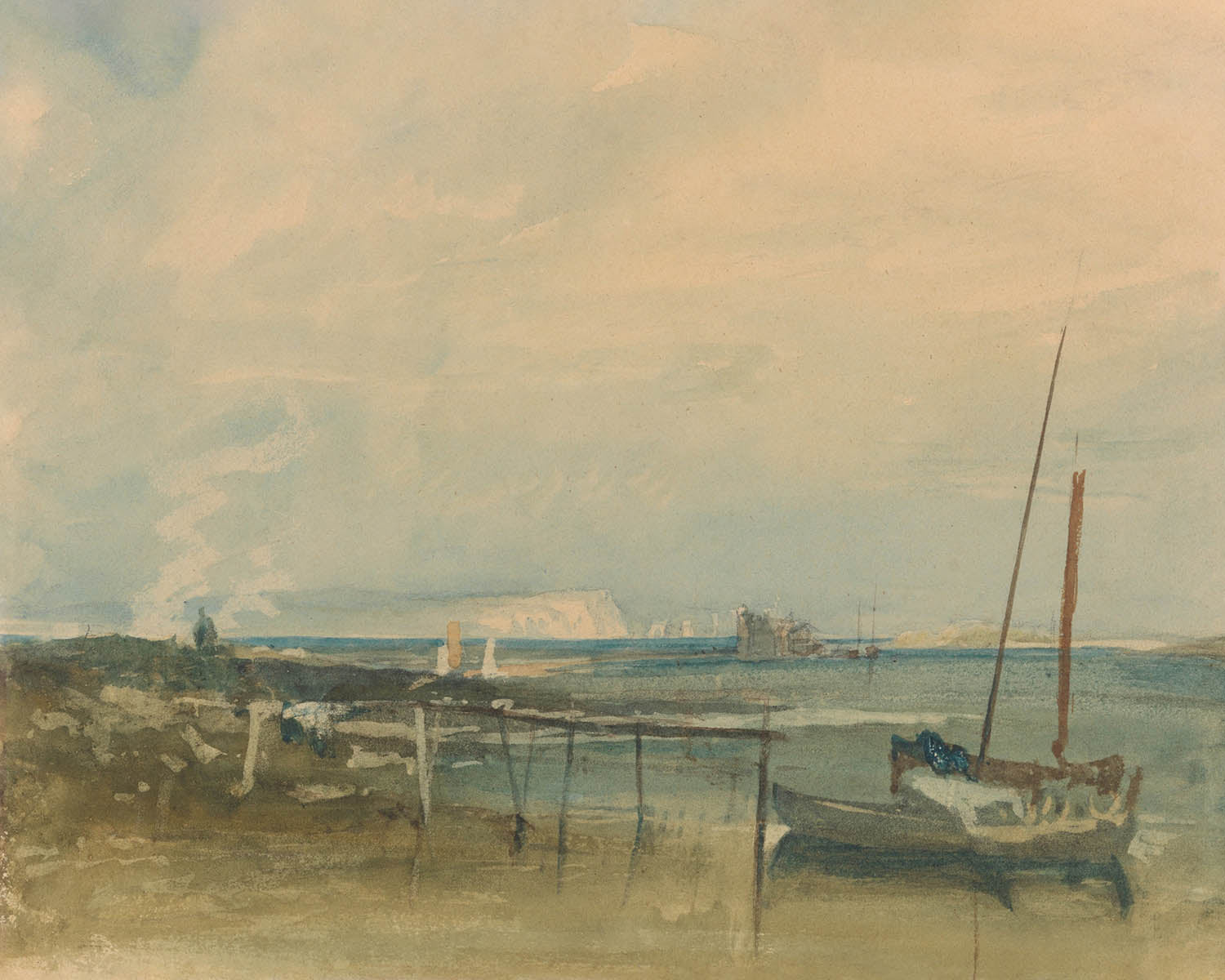 The subject here—white cliffs, open sea, and small craft at the shoreline—speaks to Britain’s maritime identity at a time of exploration, commerce, and coastal industry. Painted in 1800, the work aligns with Romanticism’s fascination with the sublime: nature as vast and changeable, humbling in its beauty. The human presence is modest but essential—boats poised between land and water—reminding us that the coast is a threshold where weather, tide, and livelihood meet.