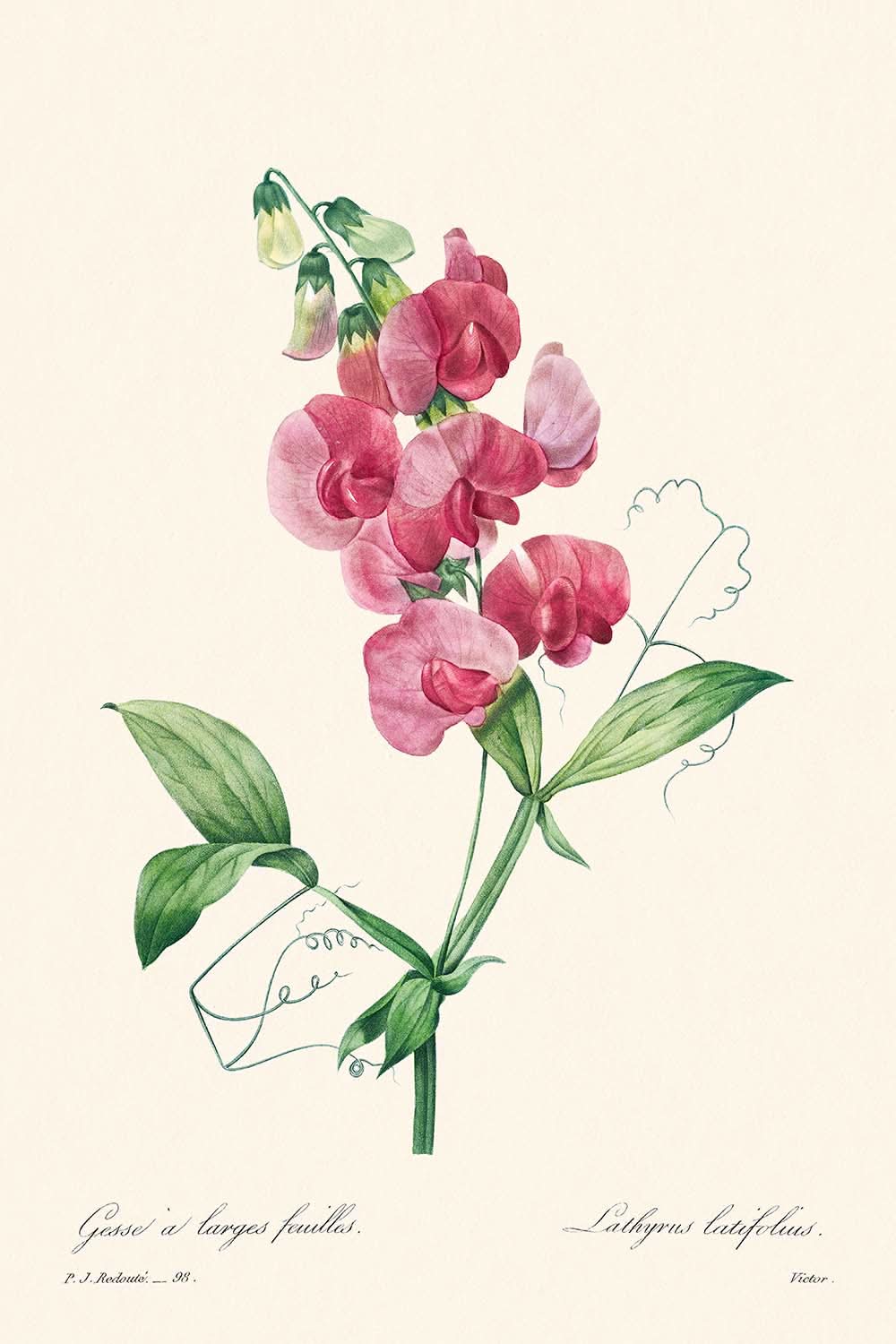 Il Pisello Perpetuo, pubblicato per la prima volta nel 1802, è un'esquisita illustrazione botanica dell'artista rinomato Pierre-Joseph Redouté. Conosciuto come uno dei più grandi illustratori botanici, Redouté trascorse gran parte della sua carriera a dipingere bellezze floreali al Château de Malmaison su richiesta di Giuseppina Bonaparte, moglie di Napoleone. Questo capolavoro vittoriano esemplifica magnificamente l'abilità di Redouté nel catturare il delicato fascino e i dettagli intricati del pisello perpetuo (Lathyrus latifolius).