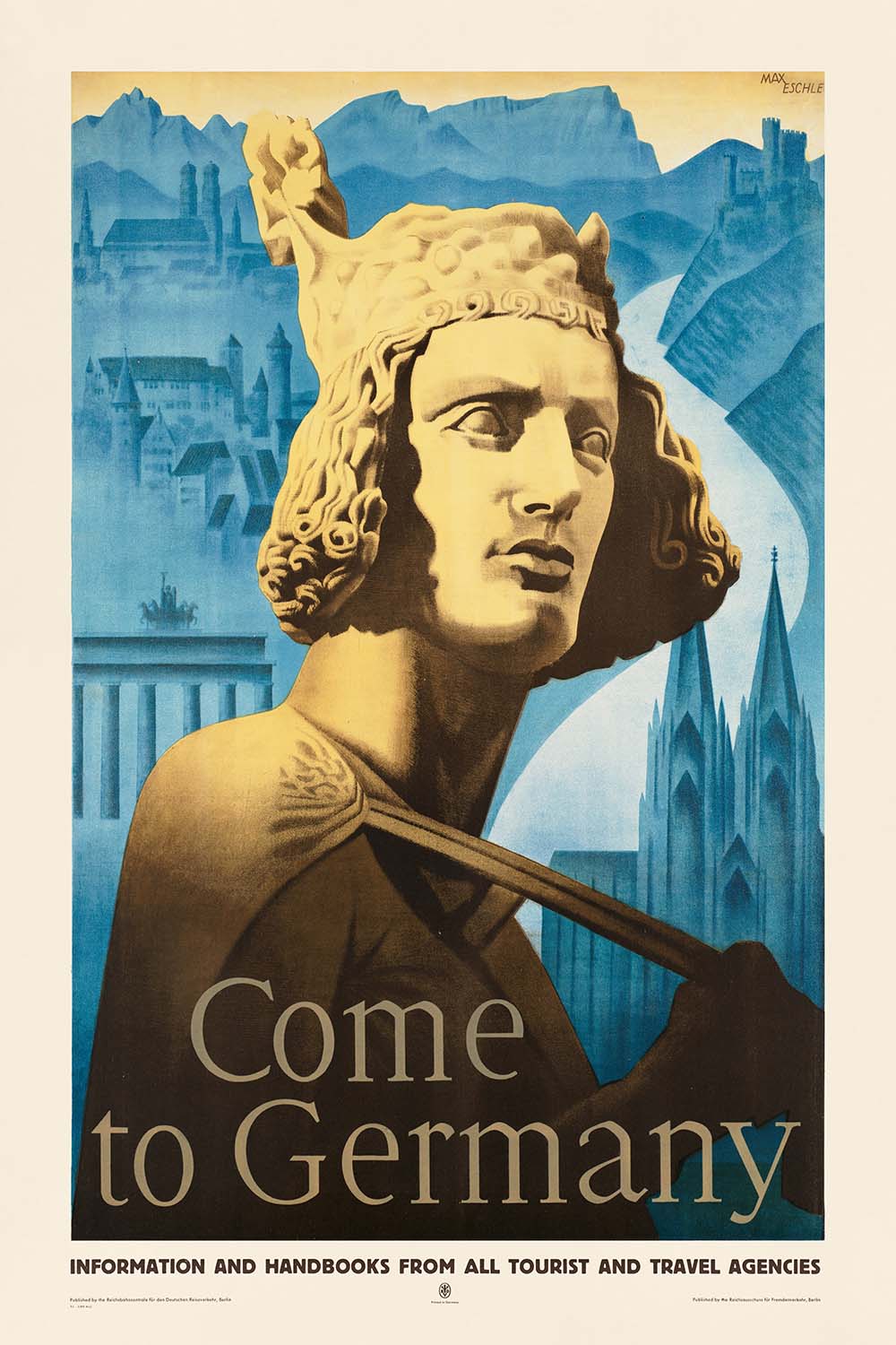 About the artist: Max Eschle was a German graphic artist active during the early to mid‑20th century, working for national and regional tourism boards. His posters are known for their theatrical compositions—monumental figures, emblematic landmarks, and clear, dignified typography—designed to be instantly legible on station platforms and city streets. Eschle favored airbrushed gradients and a restrained palette, devices that lent his work a polished, modern appeal.