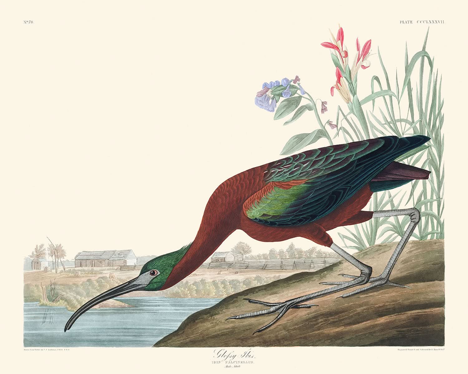 Il Ibis lucido (Tavola 387) di John James Audubon, pubblicato per la prima volta nel 1827, è un'illustrazione squisita tratta dall'opera monumentale, "Uccelli d'America." Questa straordinaria rappresentazione dell'Ibis lucido riflette l'attenzione meticolosa di Audubon ai dettagli e la sua passione per l'ornitologia.