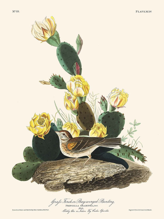 Il sapiente uso del colore e dei dettagli intricati da parte di Audubon invita gli spettatori ad apprezzare il sottile piumaggio del Passero di Erba e i suoi vivaci dintorni. Questa stampa, un esempio straordinario di arte ornitologica, porta la serenità della natura in qualsiasi spazio, rendendola un'aggiunta degna a qualsiasi collezione d'arte o decorazione per la casa.