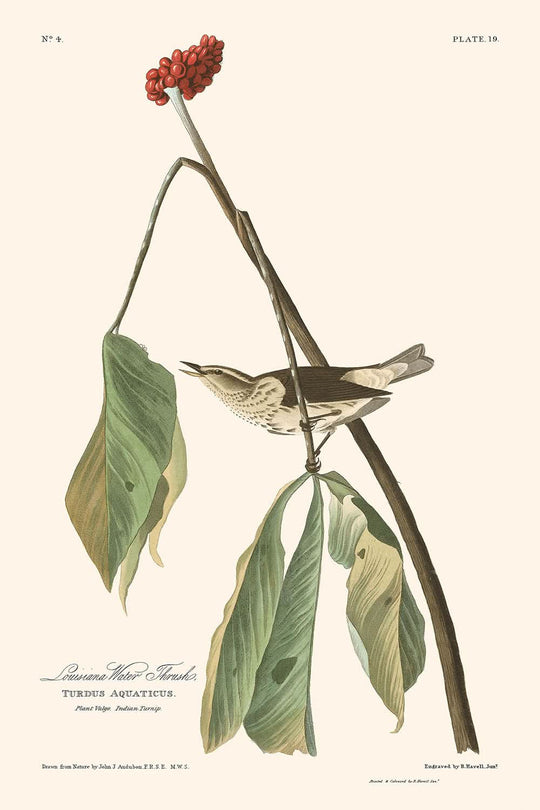 La rappresentazione del Louisiana Water Thrush è notevole per la sua intricata descrizione del canto e del comportamento dell'uccello. Audubon ammirava questa capacità musicale dell'uccello, paragonandola al Nottola. Il nome scientifico del Louisiana Water Thrush è Seiurus motacilla, arricchendo ulteriormente l'opera con il suo significato storico e biologico.