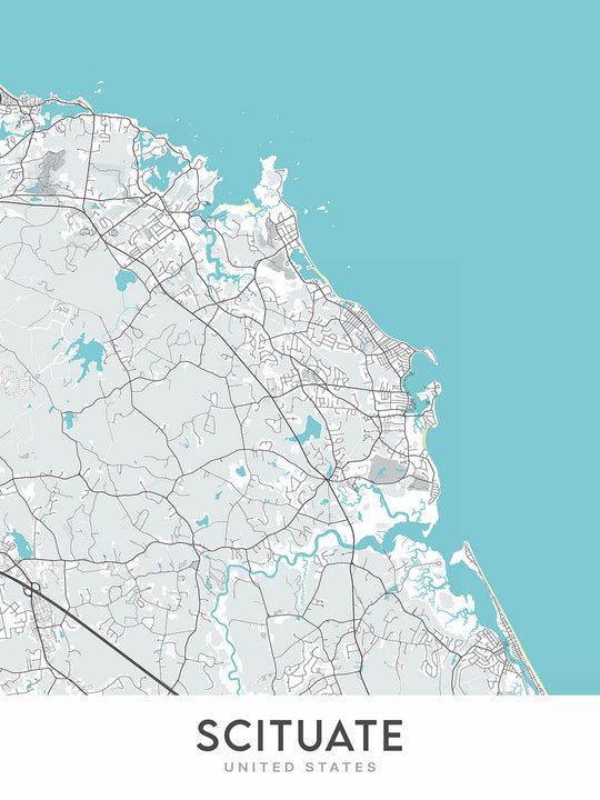 Questa mappa meticolosamente realizzata di Scituate, Massachusetts, offre una rappresentazione moderna e dettagliata di questa affascinante città costiera. Il design contemporaneo della mappa e la sua palette di colori unica la rendono un pezzo d'arte accattivante, perfetta per aggiungere un tocco di sofisticazione a qualsiasi casa o ufficio.