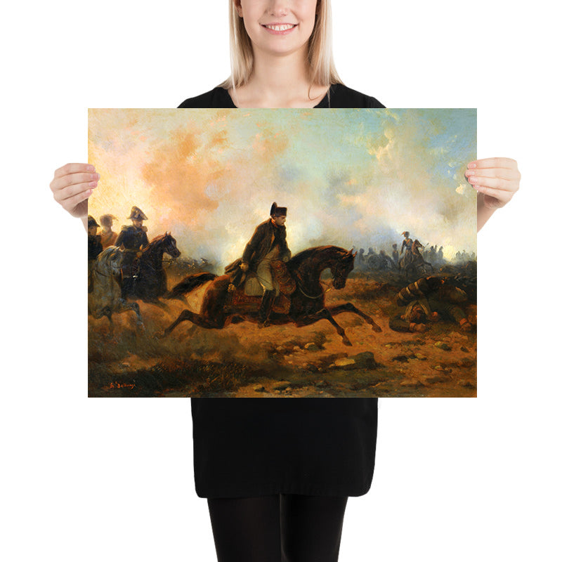Napoleon Charging at the Battle of Waterloo by Hippolyte Bellangé is a stirring Romantic-era vision of history’s most fateful battlefield. Bellangé captures the Emperor in the midst of the Waterloo campaign, driving forward at the height of the fighting as smoke and dust churn across the field. In the painting, a white charger surges into view while a gust of powder smoke rolls diagonally through the center-left, and a flash of crimson from a battle standard cuts the haze—visual cues that heighten the sense of motion and danger.