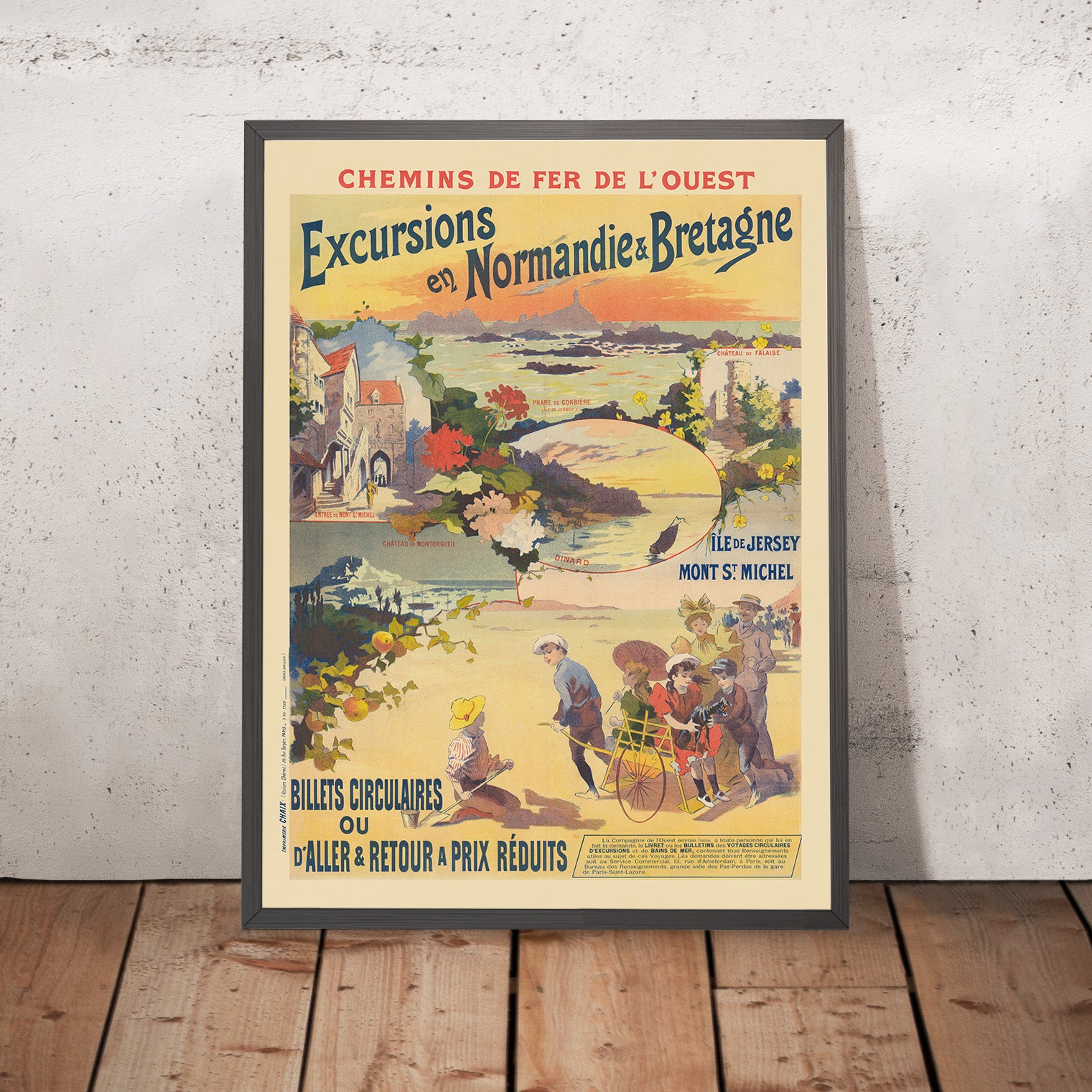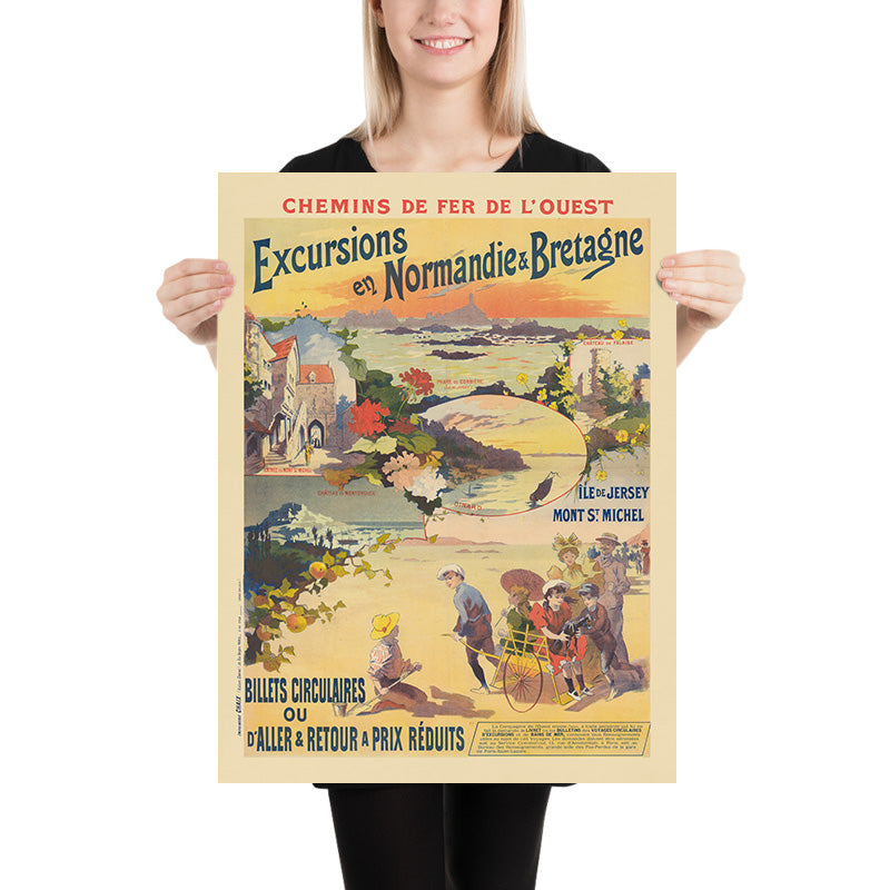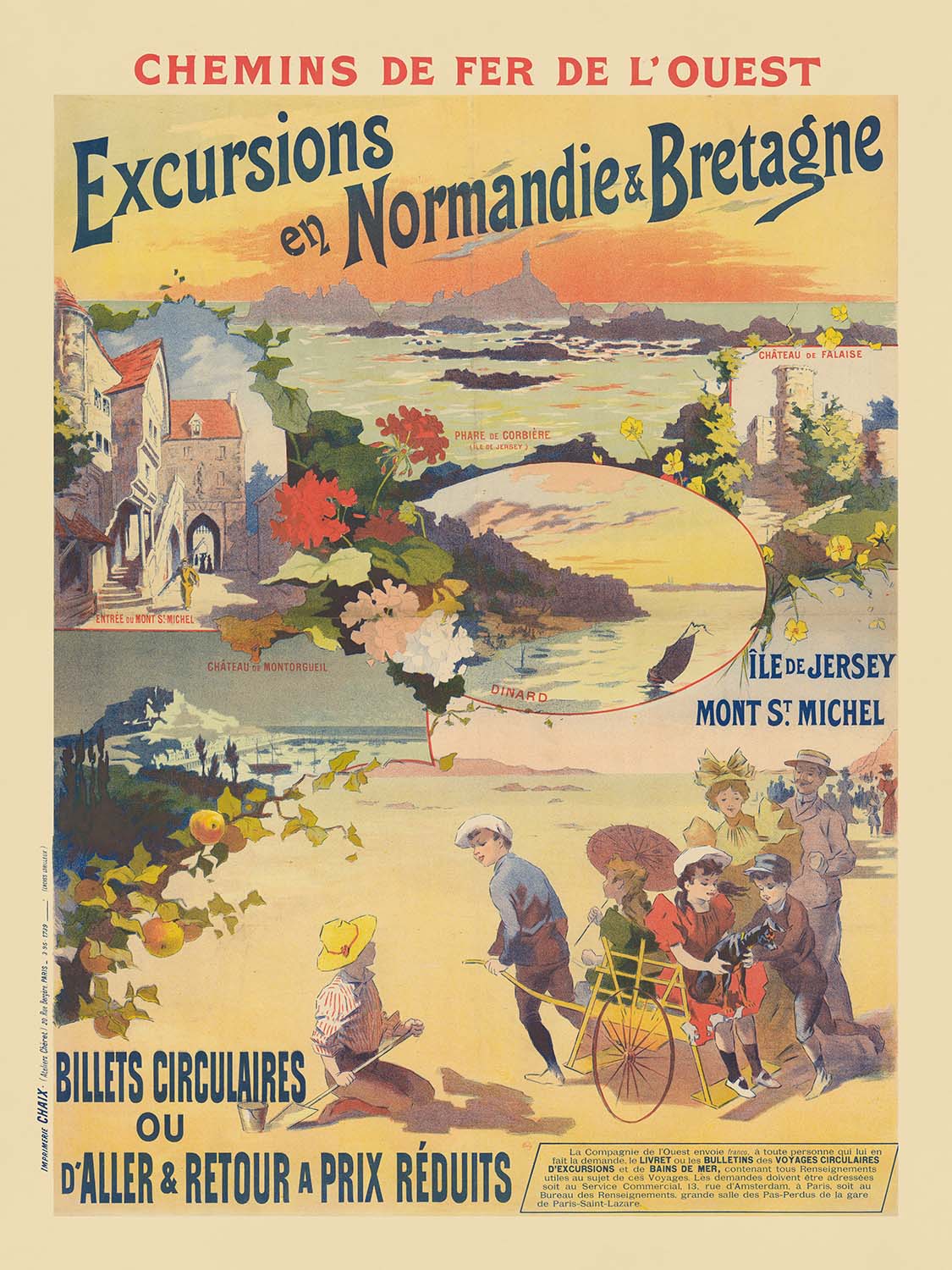 Chemins de Fer de l’Ouest. Excursions en Normandie & Bretagne by Imprimerie Chaix (1895) is a luminous Belle Époque travel poster inviting Parisians to the Channel coast. Issued for the Western Railway, it captures the romance of late‑19th‑century excursions to Normandy and Brittany—places like Mont‑Saint‑Michel, Dinard, Falaise, and the nearby island of Jersey. In the lower beach vignette, a boy tugs a wicker child’s carriage while elegant holidaymakers stroll with a parasol, a scene bathed in sunset yellows and sea‑spray blues that instantly conjures salt air and summer light.
