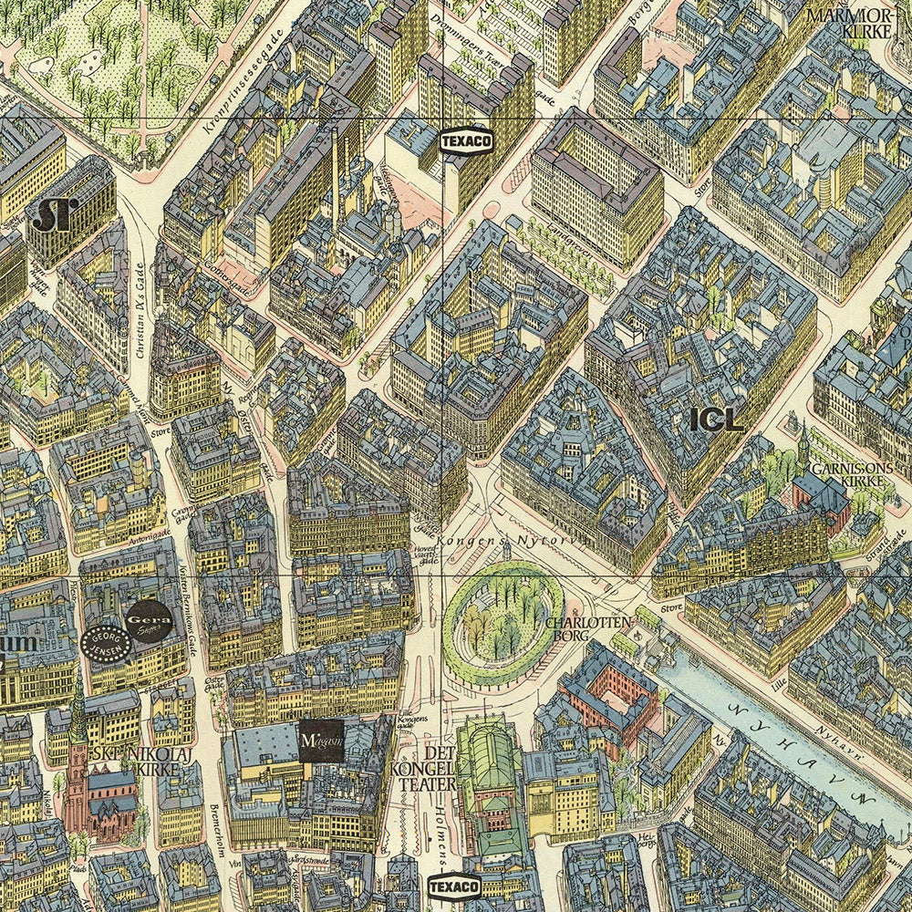 Bollmann’s artistry lies in making information beautiful. His axonometric method preserves scale and orientation while celebrating façades, rooflines, and tree canopies in vibrant, 1970s color. The result is both an evocative keepsake and a superb navigational instrument: avenues like Østerbrogade and Vesterbrogade read instantly; civic anchors such as Rådhuspladsen, Hovedbanegården, and Tivoli Gardens orient the viewer; and the harbor’s edge ties the whole composition together. This is a notable city map because it captures Copenhagen at a historical moment—pedestrian streets thriving, heritage carefully stewarded, modern culture ascendant—yet still foregrounds the timeless grammar of canals, squares, and spires that make the capital unmistakable.