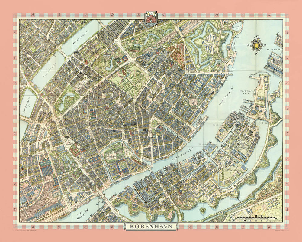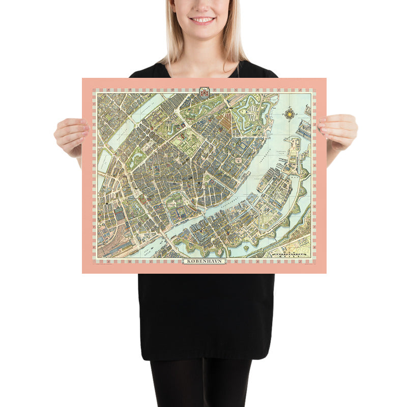 At the center, Bollmann traces Copenhagen’s civic heartbeat from Rådhuspladsen past the stone‑paved theater of Strøget, where Amagertorv and Nygade open into animated plazas and shopfronts. The Central Station (Hovedbanegården) rises as a brick red compass point, with Tivoli Gardens unfurling just beyond its platforms. Vesterbrogade and Istedgade radiate west, their facades stepping in rhythm toward Frederiksberg, while Vester Voldgade skirts the line of the vanished ramparts. Gammel Kongevej and Frederiksberg Allé create gracious perspectives that ultimately guide the viewer toward Copenhagen Zoo’s leafy precincts. As a city map, this plan excels at legibility: streets are readable, landmarks are unmistakable, and the relationships among squares, boulevards, and parks are intuitively clear.