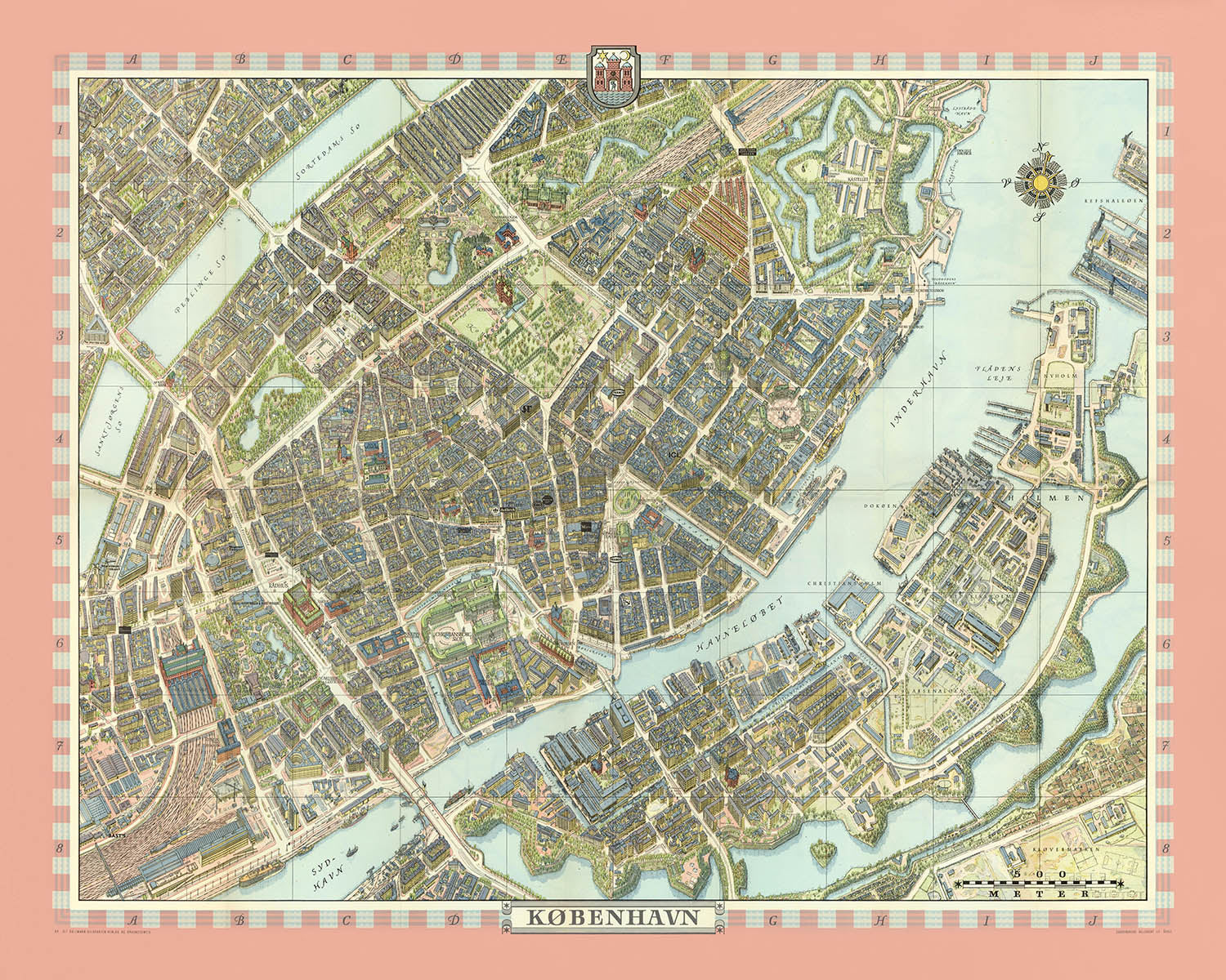 Old Bird's-Eye Map of Copenhagen by Bollmann, 1972: Nyhavn, Tivoli, Amalienborg, Rosenborg, Mermaid