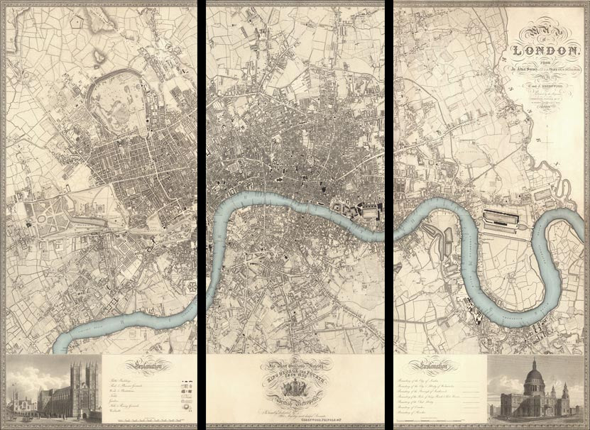 La mappa di Londra del 1830 di Greenwood è una delle migliori mai realizzate della capitale dell'Inghilterra - e il modo più bello e impattante per esporla è come un trittico.