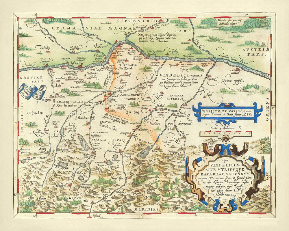 La mappa di Ortelius è più di una semplice rappresentazione della geografia fisica; è un documento storico che offre spunti sulle frontiere politiche e le tribù antiche dell'epoca. Le regioni di Vindelicia e Noricum, insieme ai riferimenti alle tribù dei Vindelici e dei Norici, forniscono una finestra sulla storia antica della Baviera. La mappa mette in evidenza anche le regioni vicine di Germania, Austria e Retia, illustrando l'interconnessione di questi territori storici.