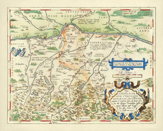 Il design della mappa è una testimonianza del talento artistico e scientifico di Ortelius. Ogni elemento, dai fiumi che scorrono come il Danubio e il Lech alle catene montuose stilizzate, è reso con precisione e cura. Gli elementi decorativi, comprese le armi e le iscrizioni latine, aggiungono uno strato di profondità storica e grandezza. Questa mappa non serve solo come guida geografica, ma anche come un'opera d'arte, catturando l'essenza dello stile cartografico rinascimentale.