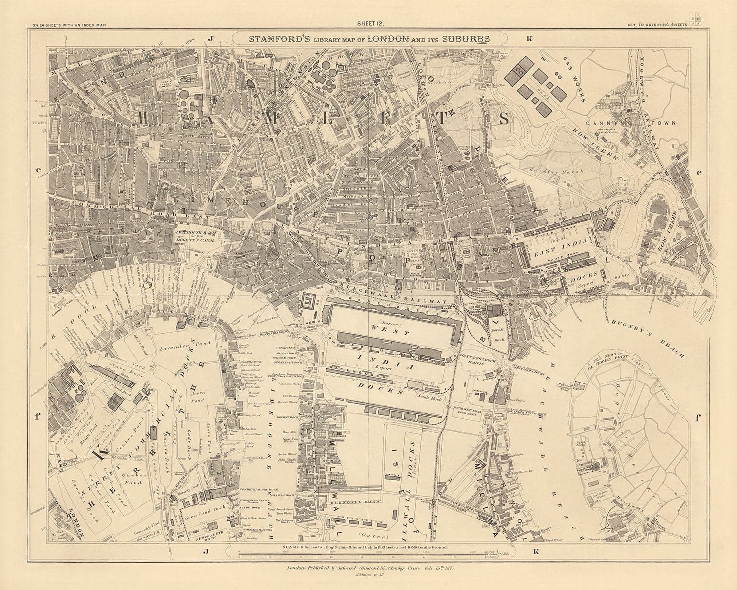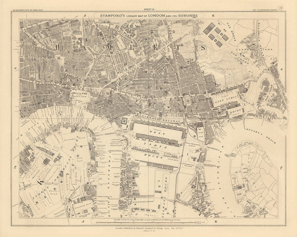 La mappa è stata originariamente pubblicata in 24 fogli. In totale, la mappa avrebbe misurato circa 2 metri di larghezza (78 pollici). Qui si trova il foglio 12, che si concentra sulle aree est e sud-est di Londra di Tower Hamlets, Limehouse, Poplar, Bow, Isle of Dogs, Surrey Quays e Rotherhithe - con un po' di Greenwich nell'angolo in basso a destra (dove si trova oggi l'O2!)