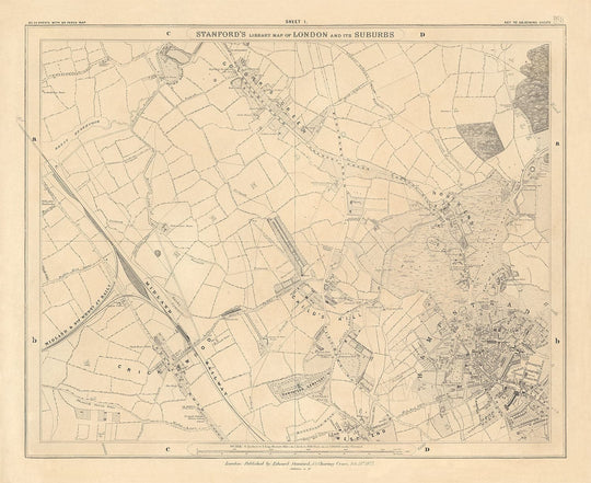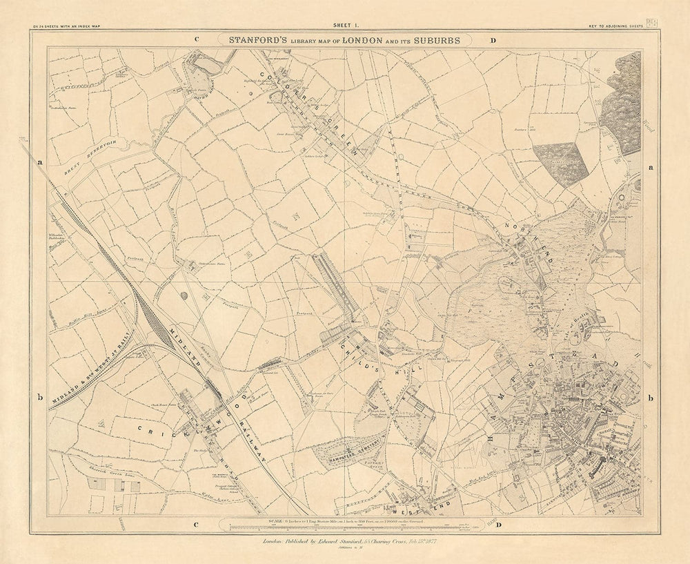 La mappa è stata originariamente pubblicata in 24 fogli. In totale, la mappa avrebbe misurato circa 2 metri di larghezza (78 pollici). Questa qui è il foglio 1, che si concentra sui quartieri settentrionali di Londra di Camden, Brent e Barnet.