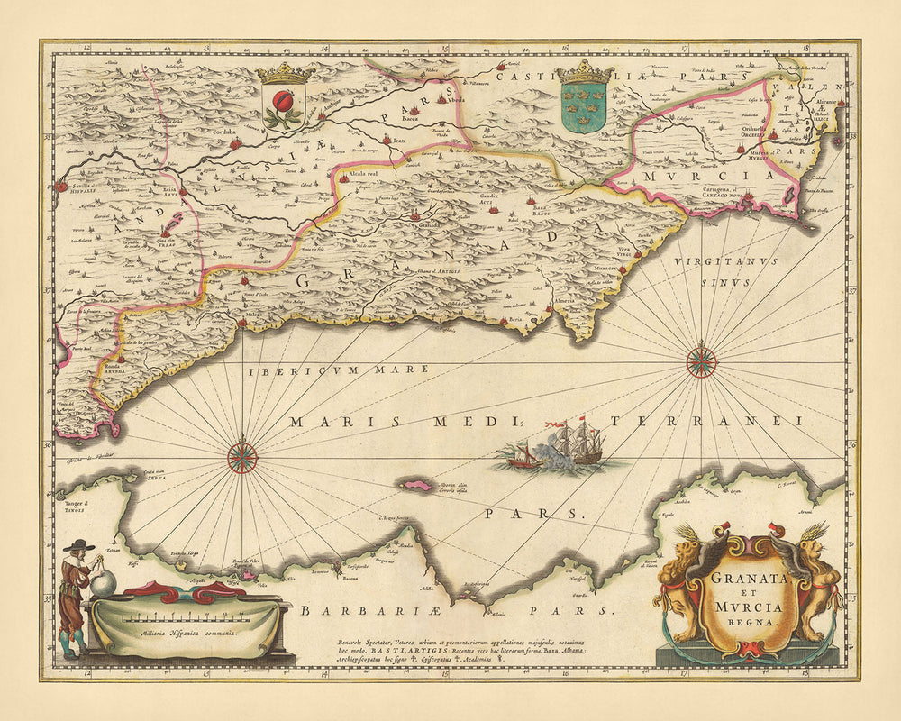 Vivi la grandezza del passato con la mappa 'Granata, et Murcia Regna', un'eccellente rappresentazione dei Regni di Granada e Murcia, regioni che fanno parte della Spagna moderna. Questo capolavoro è stato realizzato da Nicolaes Visscher II nel 1690, un rinomato cartografo che ha ereditato l'eredità di suo nonno, Claes Janszoon Visscher, una figura di spicco dell'età d'oro olandese della cartografia. La mappa, tradotta in 'I Regni di Granada e Murcia', offre uno sguardo affascinante nel panorama storico e politico di queste regioni, presentando un'opportunità per viaggiare indietro nel tempo ed esplorare i dettagli geografici intricati di un'epoca passata.