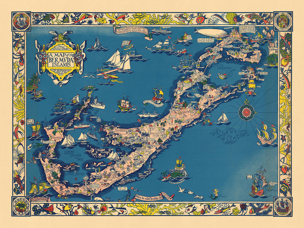 - Contesto interessante riguardo a quei temi: La mappa riflette la ricca storia marittima delle Bermuda e lo stile immaginativo e giocoso delle mappe pittoriche dei primi del '900.
