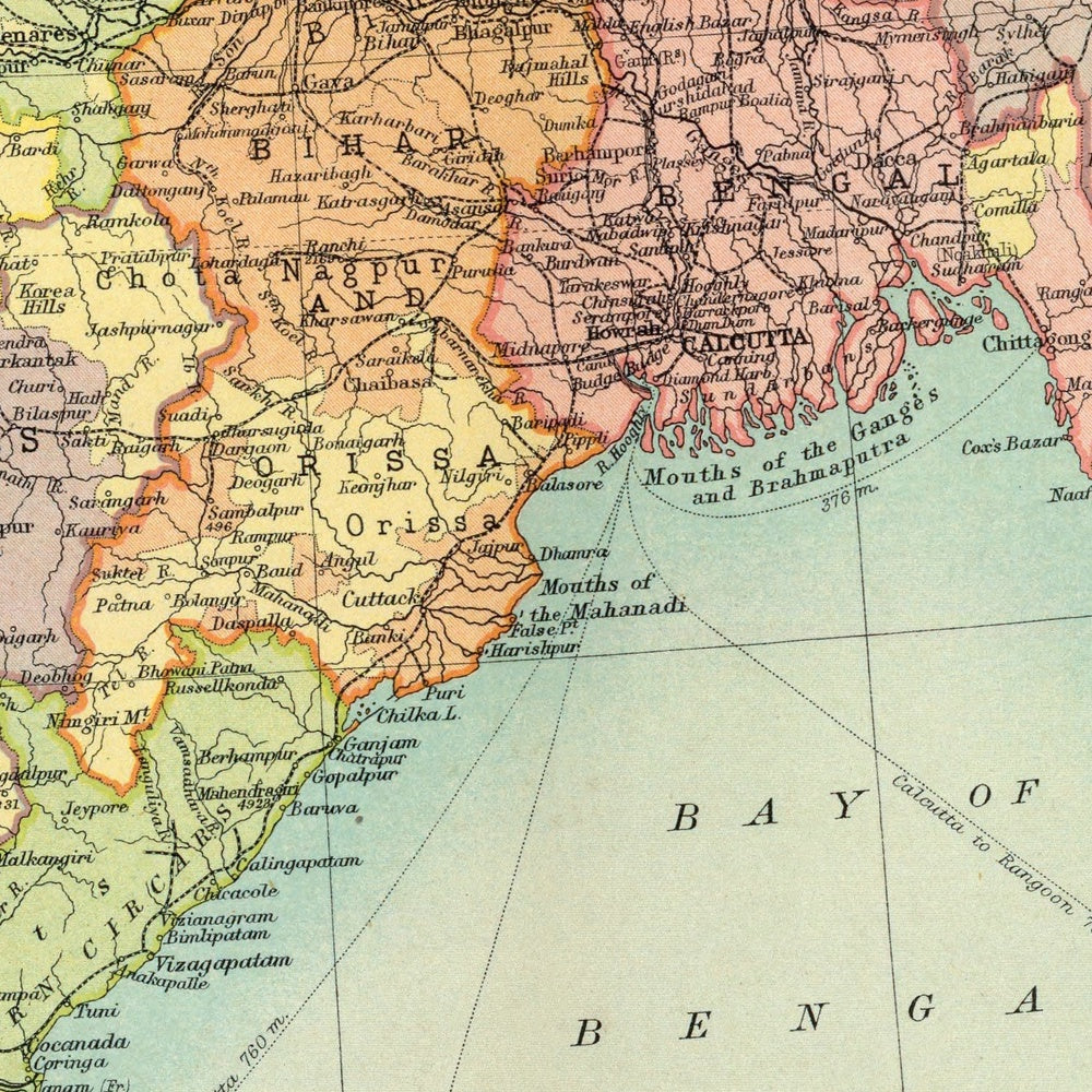 Topography is conveyed with Bartholomew’s hallmark restraint: spot heights and measured shading produce a tactile sense of the land without overwhelming the political story. The Himalaya surge along the northern rim, feeding the Indus, Ganges, and Brahmaputra systems whose broad alluvia shape the subcontinent’s human geography. The Western and Eastern Ghats frame the Deccan plateau, while the Vindhya and Satpura ranges articulate central India. Eastward, the Arakan Yoma and Tenasserim ranges march down Burma toward the Isthmus, projecting into the Andaman Sea. Great rivers—the Godavari, Krishna, and Kaveri in the south—anchor agrarian basins and portage routes, with deltas etching their way to Madras (Chennai), Calcutta (Kolkata), and Colombo.