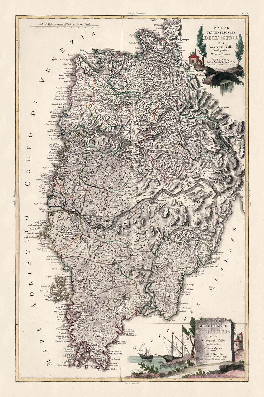 Titled Istria, this 1784 engraving stands as a luminous chapter in Antonio Zatta’s Atlante novissimo, the Venetian publishing triumph that married rigorous geography with painterly elegance. Drafted by Giovanni Valle Giustinoplitano and issued from Zatta’s celebrated press, the sheet centers the storied peninsula that today spans Croatia and Slovenia, placing it with precision along the Adriatic rim. The composition balances science and spectacle: lucid coastal outlines and carefully notated interiors are framed by decorative borders and an ornate cartouche that hints at the region’s classical and maritime inheritance. At a glance, one perceives both a navigable landscape and a readable history—an 18th-century vision of Istria as crossroads, frontier, and nautical stage, refined through the atelier’s meticulous hand-coloring and the cool logic of Enlightenment cartography.