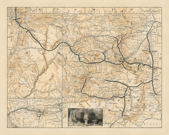 Entra nel passato leggendario del West americano con questa straordinaria mappa del 1882 del sistema ferroviario Denver e Rio Grande, un raro artefatto dell'inizio dell'era ferroviaria della regione. Creata dalla Denver & Rio Grande Railroad stessa, questa mappa è stata progettata come un pezzo promozionale, catturando un momento trasformativo in cui i binari di ferro cucivano insieme i paesaggi aspri del Colorado, dello Utah e del New Mexico. La sua pubblicazione seguì da vicino la creazione della contea di San Miguel, contrassegnandola come un'edizione precoce e molto ricercata. Per collezionisti e appassionati di storia, questa mappa offre una finestra sull'ambiziosa espansione delle ferrovie che avrebbero per sempre alterato il tessuto economico e sociale del West.