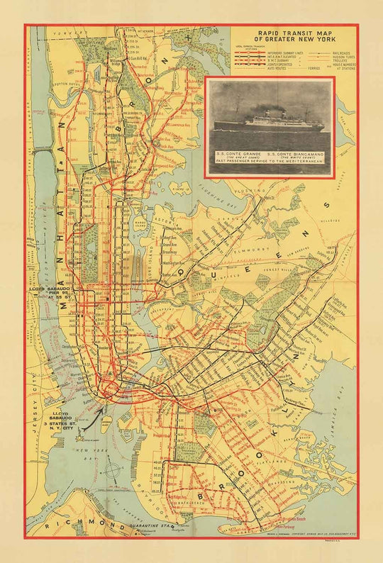 Una bellissima mappa vintage altamente dettagliata della metropolitana di New York (o Trasporto Rapido come veniva chiamata allora), pubblicata originariamente nel 1927 dalla Ohman Map Co.