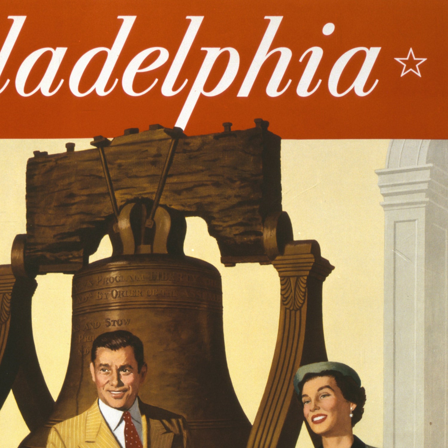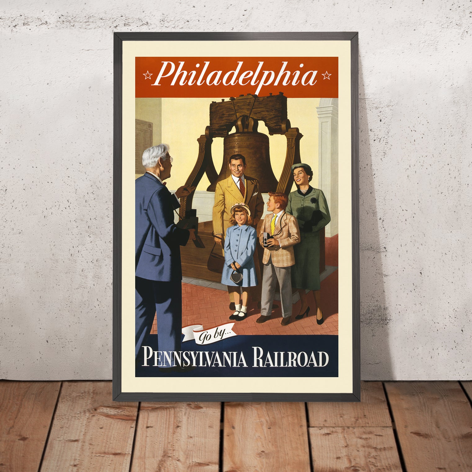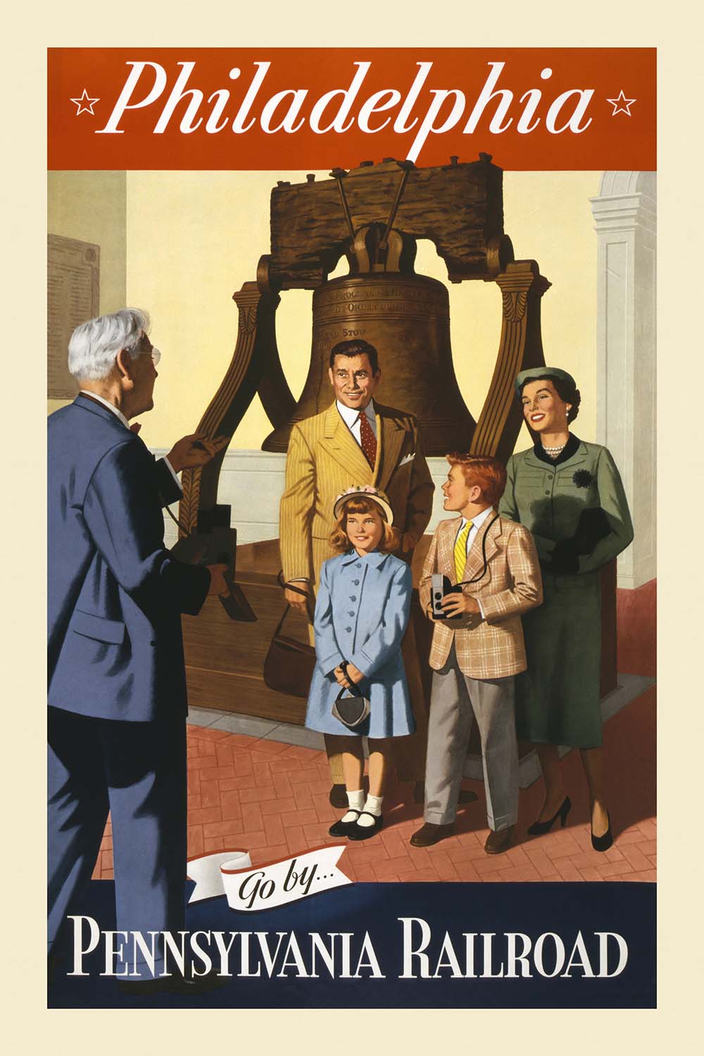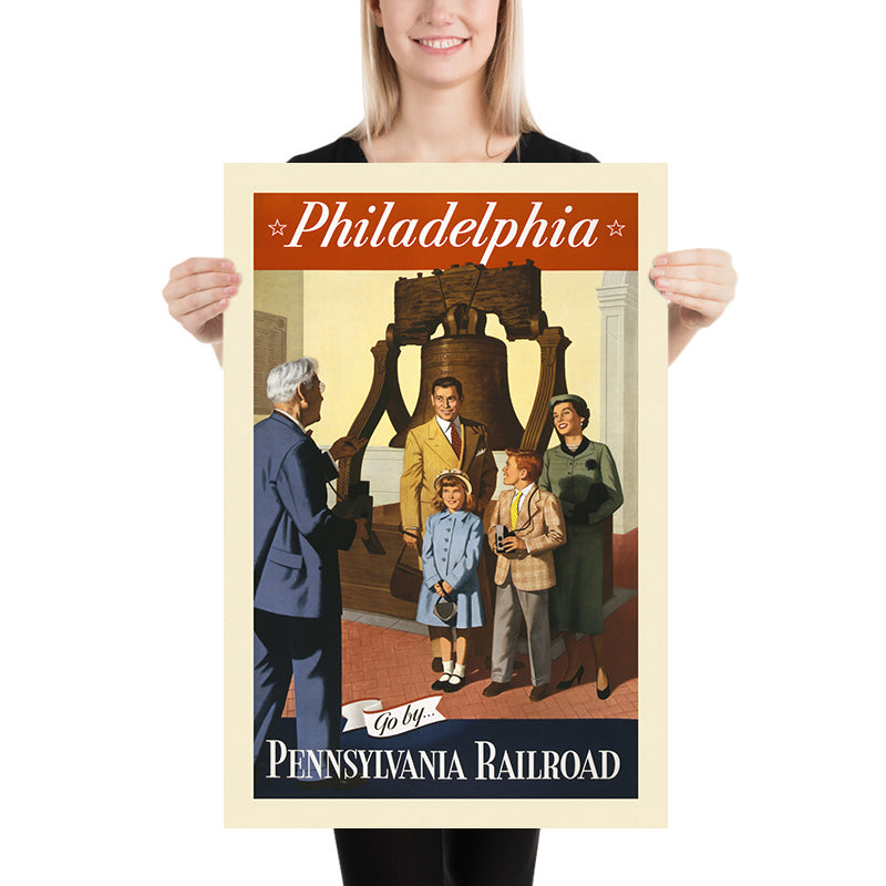 “Philadelphia. Go by… Pennsylvania Railroad” is a mid-century American travel poster created in 1955, attributed to the Pennsylvania Railroad’s in-house advertising studio (artist unknown). Designed at the height of the postwar travel boom, it blends realism with idealized storytelling to invite families to discover the nation’s birthplace by rail. Centered on the Liberty Bell—a universally recognized emblem of freedom—the composition captures the warm optimism of the 1950s and links it directly to Philadelphia’s historic charm.