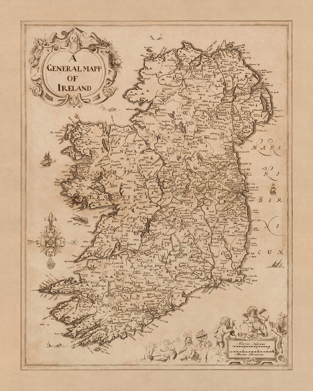 Questa mappa è molto dettagliata, mostrando strade, ponti, città, luoghi, vescovadi e arcivescovadi che erano presenti nella fine del XVII secolo in Irlanda. Colline, foreste, fiumi, laghi e loughs sono mostrati in modo pittorico. La mappa copre l'intera isola d'Irlanda e mostra il paese diviso nelle sue quattro province: Ulster, Leinster, Munster e Connacht. La mappa mostra anche le posizioni delle principali città e paesi in Irlanda, così come le posizioni dei principali fiumi e laghi del paese.