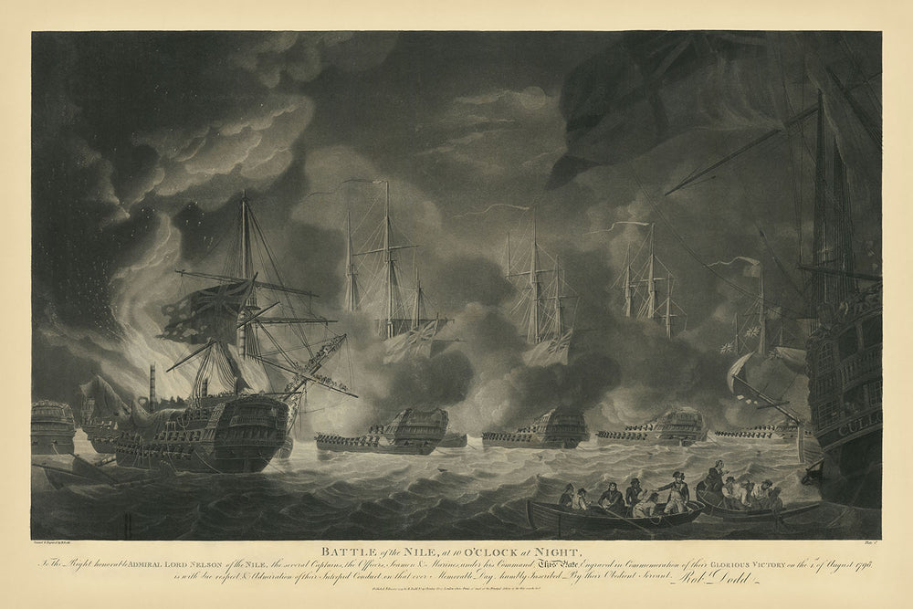 "Battaglia del Nilo, alle 10 di sera, Al nobile ammiraglio Lord Nelson del Nilo..." di Robert Dodd, è una rappresentazione iconica di una delle battaglie navali più decisive della storia. Questa drammatica acquaforte, pubblicata nel 1799, cattura l'intensità della battaglia nella notte dell'1 agosto 1798, illustrando i momenti critici della flotta britannica sotto Horatio Nelson contro i francesi.