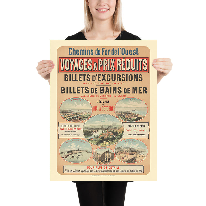 The subject matter captures a pivotal moment in French social history: the vogue for seaside “bains de mer” and the new freedom of weekend excursions by rail. On the poster you’ll spot practical details that made these trips possible—excursion tickets valid for one month, sea‑bathing tickets valid from Friday to Monday, issued May through October—paired with enticing views of Normandy and Brittany. For many, these towns and beaches remain beloved getaways from Paris.