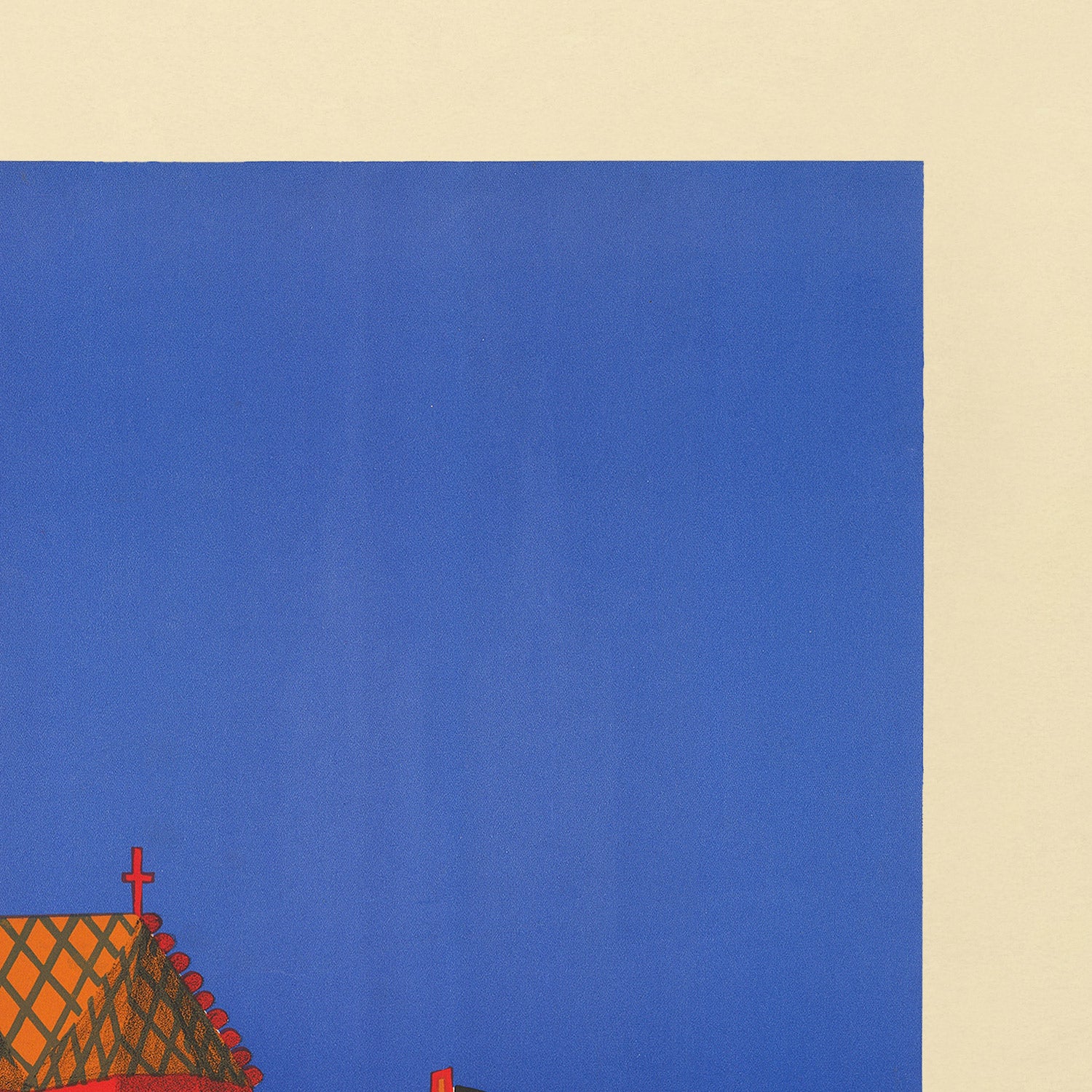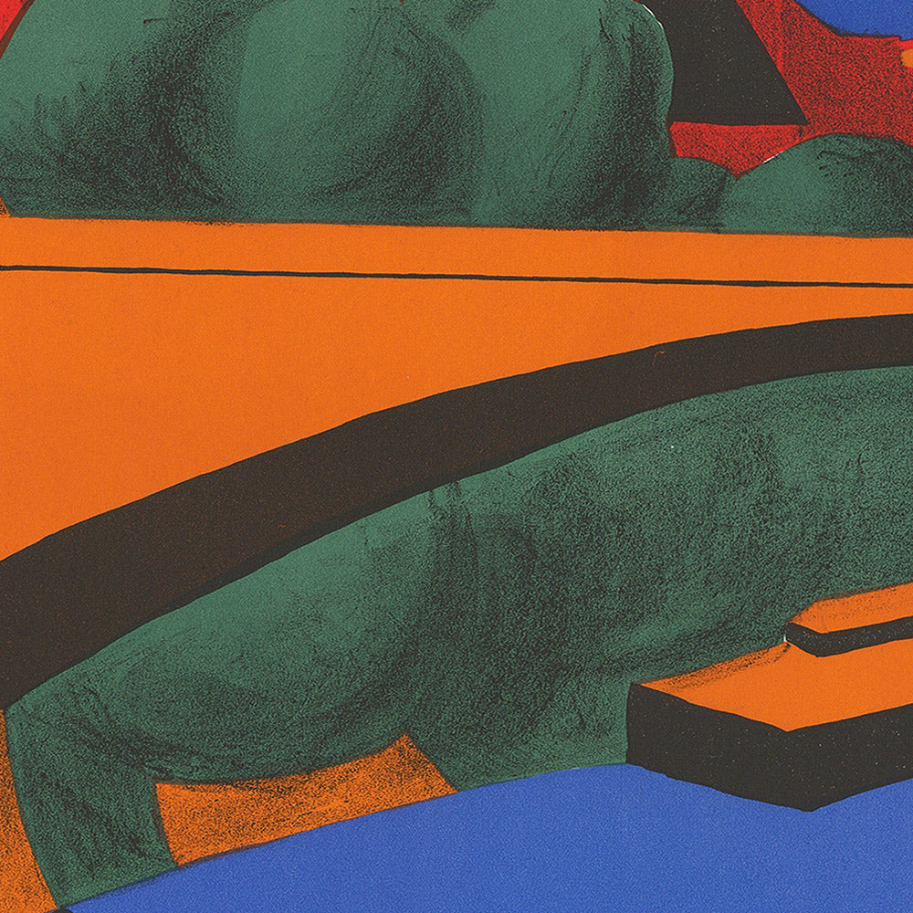 Visually, the work is a masterclass in Art Deco reduction: cobalt-blue sky and river dominate, keyed against a glowing orange bridge and embankment, with bottle-green trees and scarlet spires for crisp contrast. A dramatic black curve sweeps across the water like a shadow or current, and the monumental “BASEL” at the foot anchors the composition. The strong geometry and radiant palette make this an arresting focal point—ideal for anyone who has walked the Rhine, visited the Minster’s tiled roof, or simply loves modernist poster design.