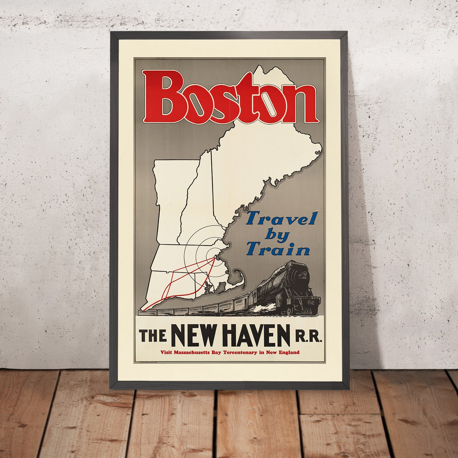 “Boston. Travel by Train” is a classic New England railway poster created for the New York, New Haven & Hartford Railroad—the famed “New Haven R.R.”—by an anonymous studio artist, likely around the Massachusetts Bay Tercentenary celebrations of 1930. The composition is instantly memorable: oversized red “Boston” lettering spans a crisp white silhouette of New England, while a powerful black steam locomotive barrels across the lower edge of the image. To the left of the engine, red route lines crisscross southern New England, and a set of concentric rings radiates from Boston, underscoring the city’s role as the region’s hub.