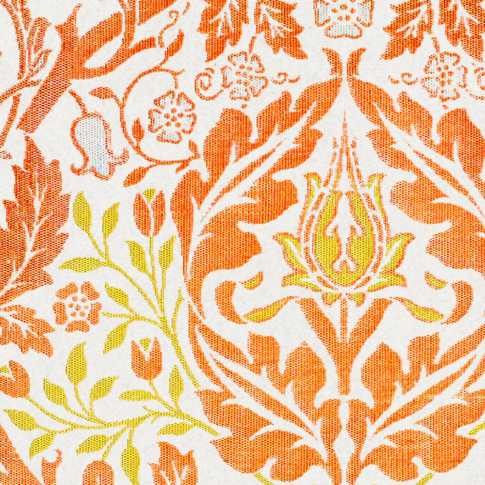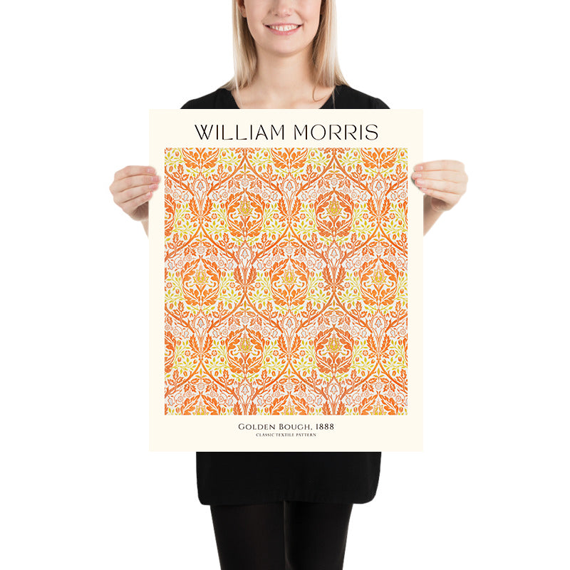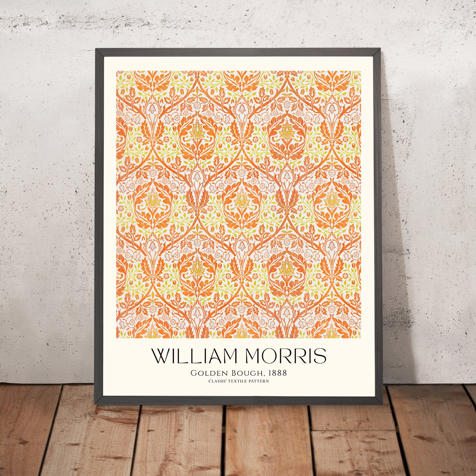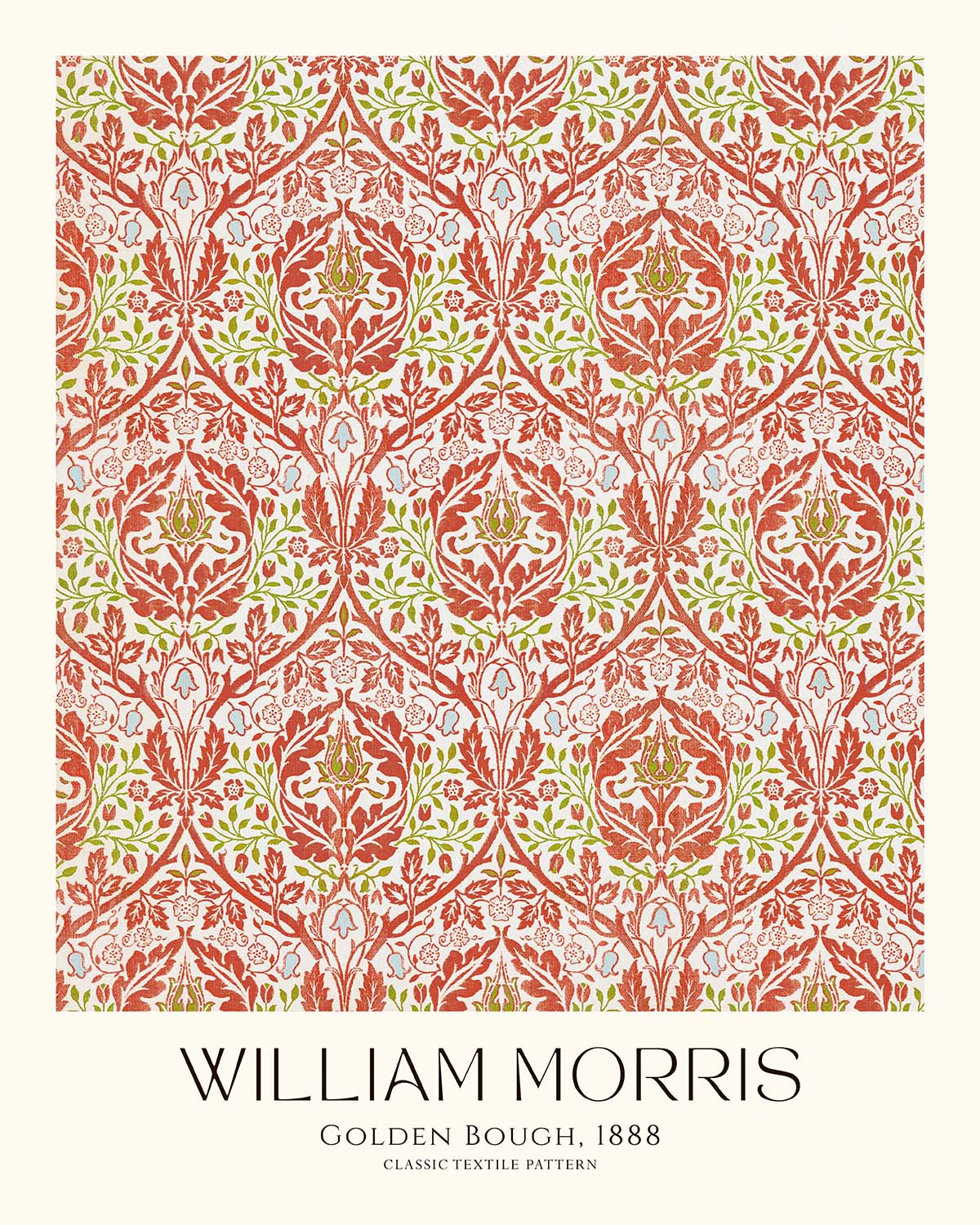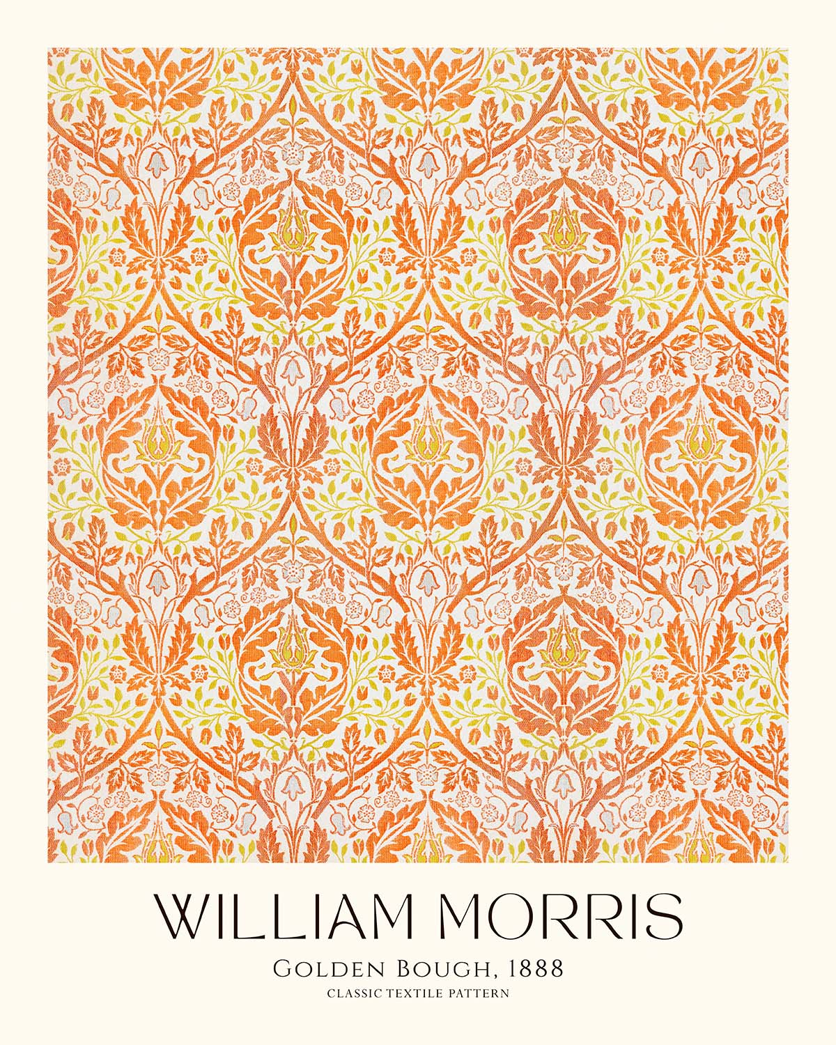 Golden Bough by William Morris (1888) is presented here as a meticulously restored, high-quality print of an original Arts & Crafts design. Most likely conceived as a wallpaper pattern, this richly worked composition could equally have been adapted for textiles such as curtains, carpets, or furnishing fabrics. Its repeating arrangement of interlaced boughs, stylized foliage, and floral ornament reflects the damask tradition—an ornamental language with roots in Renaissance and Baroque interiors—reimagined through Morris’s nature-first philosophy.