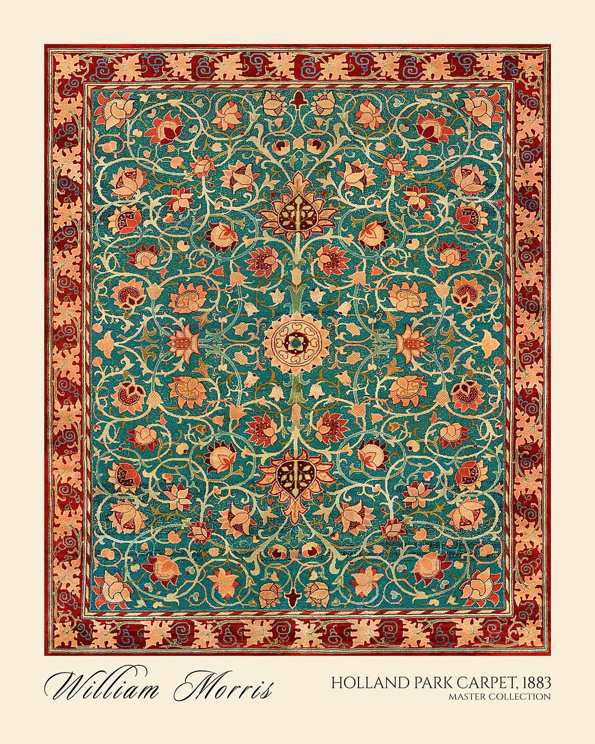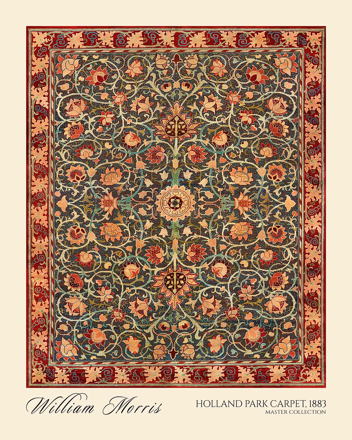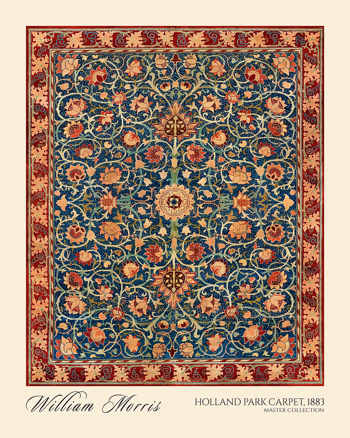 The Holland Park Carpet design exemplifies Morris’s fascination with classical Persian weaving, particularly the floral arabesques and structured medallion layouts associated with Safavid-era textiles. The field is animated by scrolling stems, clustered rosettes, and palmette-like forms that radiate with calm symmetry. Repetition and mirrored balance create a sense of paradise garden order—an endlessly renewing pattern that invites the eye to wander while remaining centered and serene.