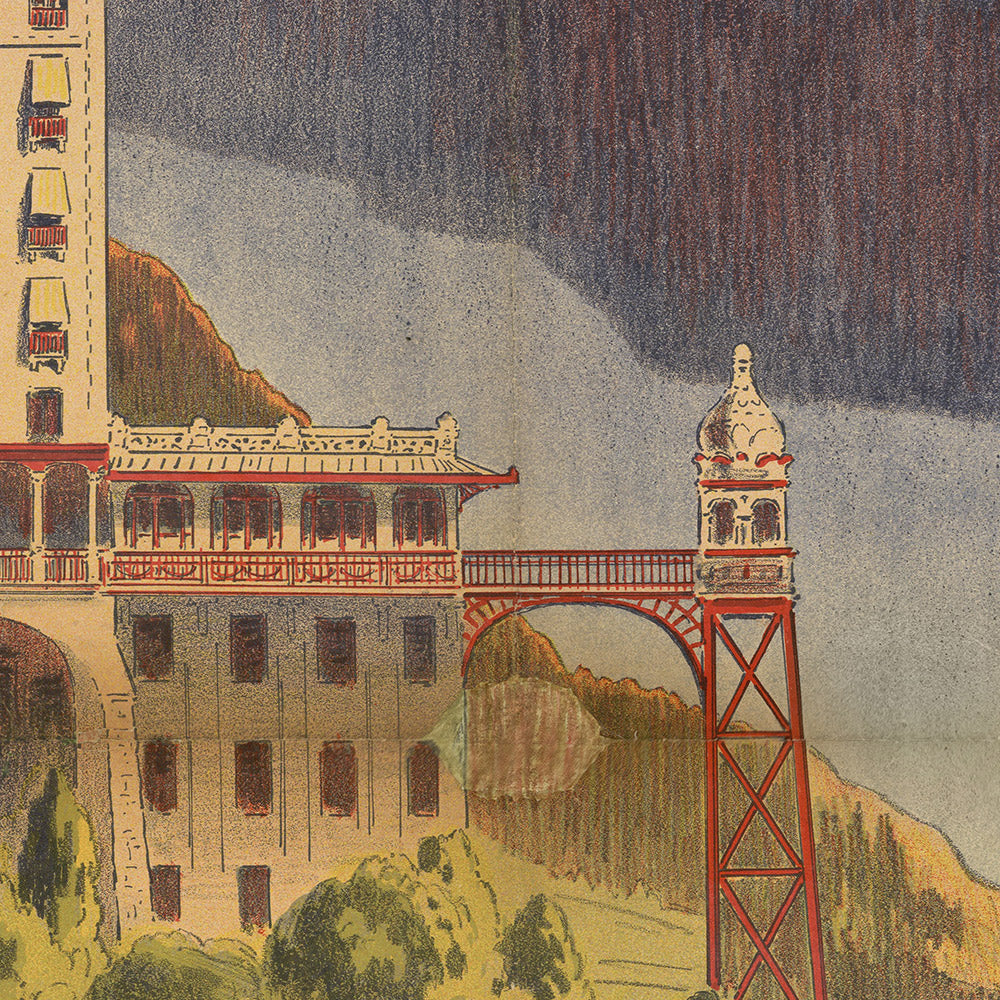 This Swiss view is emblematic of the era when Alpine tourism blossomed and lake steamers, mountain railways, and grand hotels turned natural panoramas into destinations. Brunnen, poised on a dramatic curve of Lake Lucerne, looks toward storied shores long linked with Swiss independence and civic myth—landscapes whose legends, promenades, and spa culture drew visitors from across Europe. The poster’s clever montage—framing leisure scenes in circular vignettes while rendering the hotel in clean architectural lines—suggests not just a building but an entire experience.