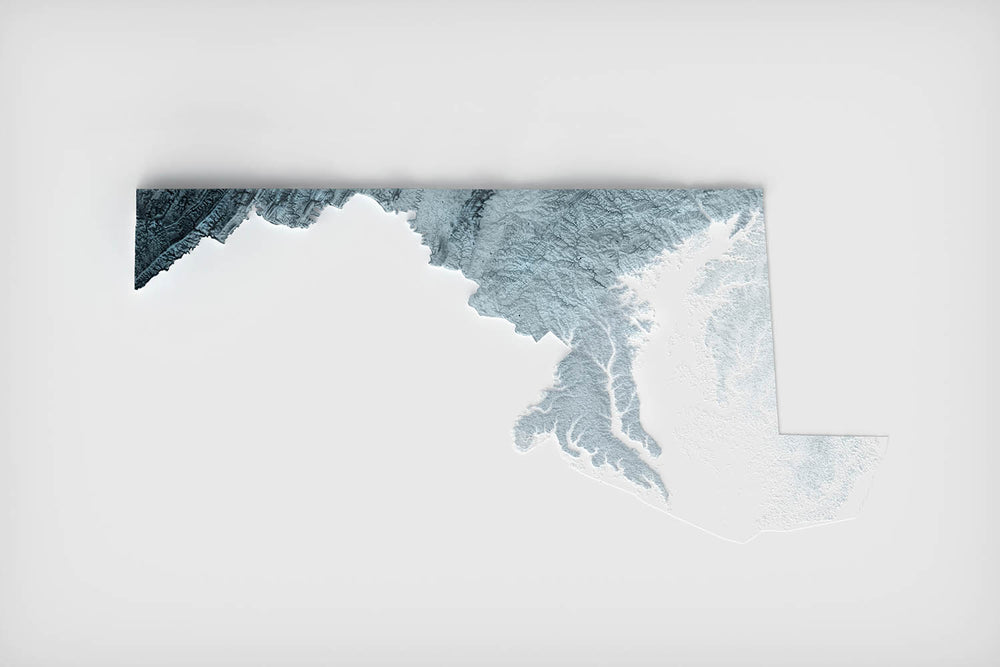 Bring the landscape of Maryland to life with a detailed topographical map that captures the state’s remarkable contrasts and scenic beauty. This map elegantly reveals the unique features that define Maryland, from the softly undulating Piedmont hills in the north to the dramatic rise of the Appalachian Mountains in the far west. Light and shadow are expertly applied to accentuate the sharp ridges and deep valleys of the Allegheny Plateau, highlighting Maryland’s highest points as they emerge boldly from the surrounding terrain.