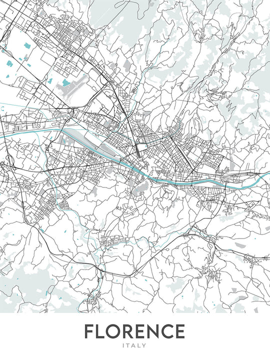 This map of Florence is a modern, detailed street map that focuses on the city's unique cartography, modern design, and unique colorways. The map covers a large area of the city, including many of its most popular neighborhoods, such as the Duomo, Oltrarno, and Santa Croce. It also includes many of the city's most famous landmarks, such as the Cathedral of Santa Maria del Fiore, the Ponte Vecchio, and the Uffizi Gallery. This map is perfect for anyone who wants to explore the city of Florence in detail.
