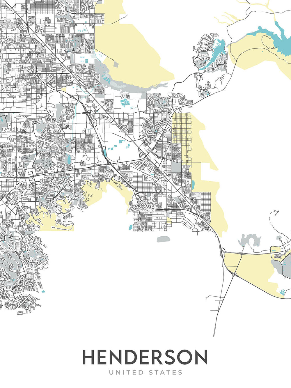 This original creation by The Unique Maps Co. features unique cartography, modern design, and a striking color palette. The map is printed on high-quality paper and is available in a variety of sizes to suit your needs. Whether you're a local resident or just a visitor, this map is a great way to explore and appreciate the city of Henderson.