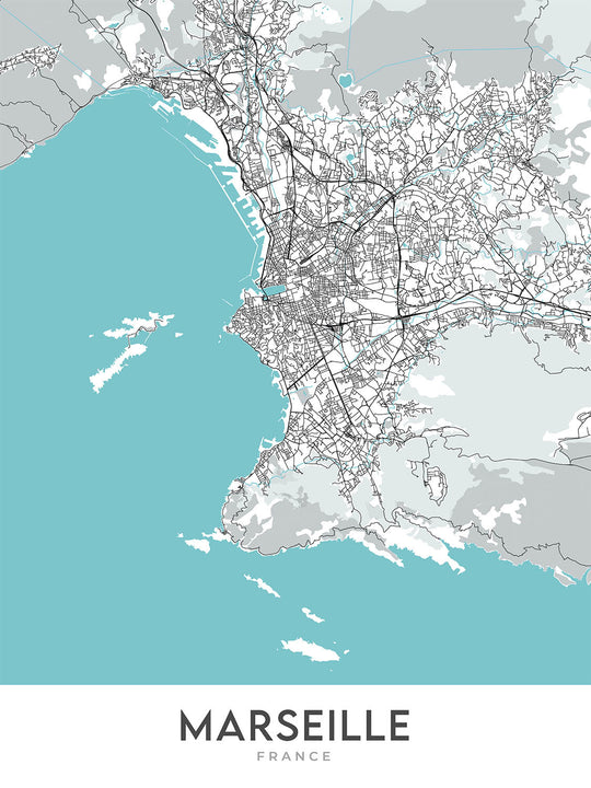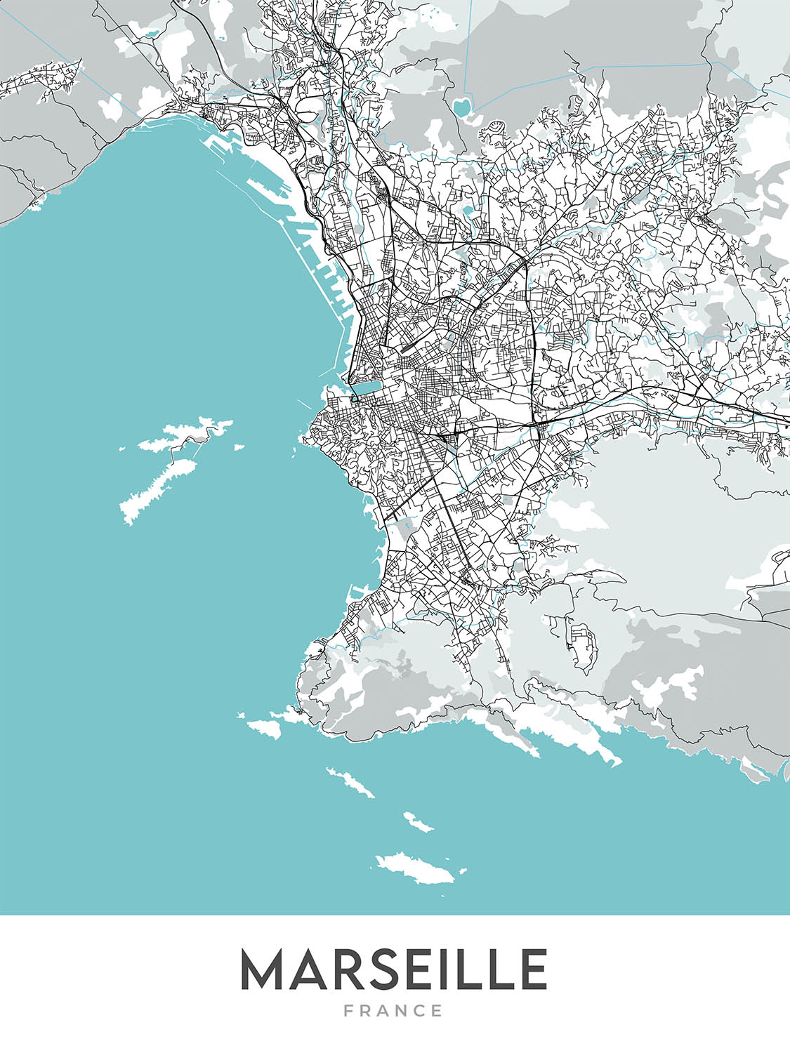 This map of Marseille is a modern and detailed cartographic artwork that focuses on the urban landscape of this vibrant city in southern France. The map covers a significant portion of Marseille, including the city center and its surrounding neighborhoods, offering a comprehensive view of the city's layout and its most iconic landmarks.