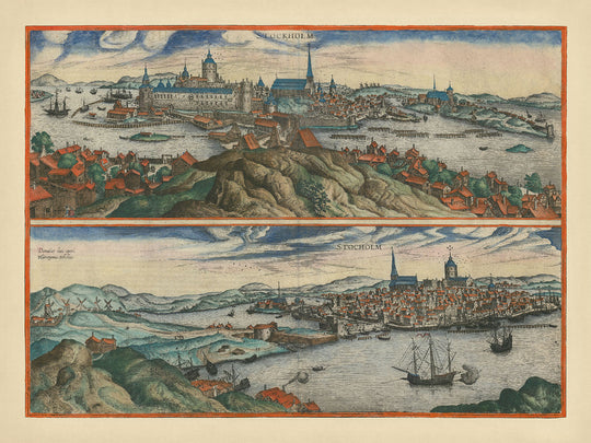 Behold the exquisite "Stockholm / Stocholm" map, crafted in 1599 by the illustrious Georg Braun and Frans Hogenberg. This bird’s-eye view map offers a captivating glimpse into the urban landscape of Stockholm during the late 16th century. As part of the renowned Civitates Orbis Terrarum atlas, this map captures the essence of Stockholm's intricate network of waterways, bustling with ships and boats, underscoring the city's reliance on water transport. The detailed illustrations of the city's architecture, including the prominent Royal Palace, transport the viewer back to a time when Stockholm was emerging as a significant European capital.
