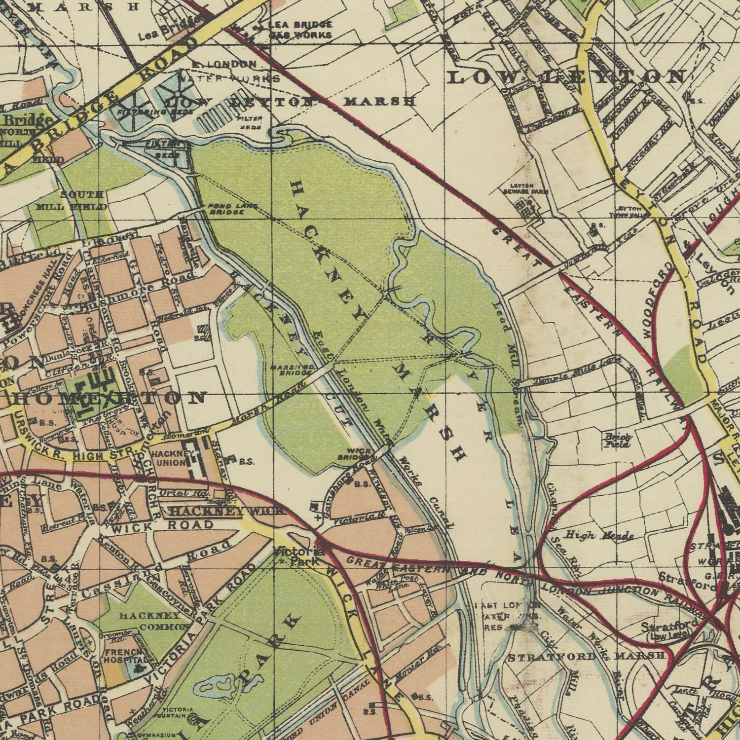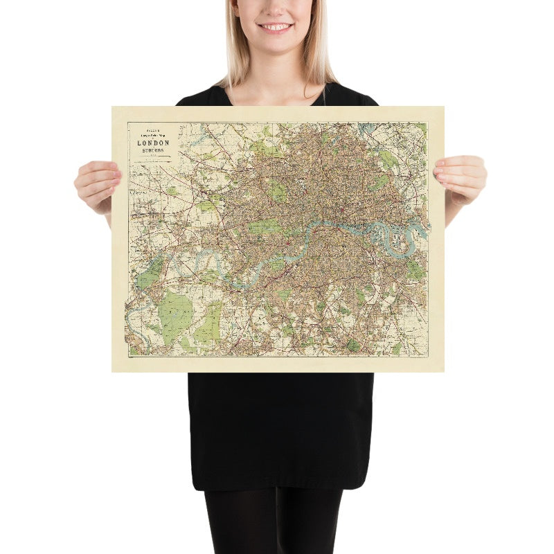 Most distinctive is the sweep to Richmond, where Richmond Road threads toward river bends, towpaths, and parkland. This westward extension—uncommon at this scale—encompasses the botanical marvel of Kew Gardens, the royal expanses of Richmond Park, and the leafy interstices of Barnes and Putney, revealing how green space softens the city’s edge. Here the Thames broadens and meanders, and the suburban ideal takes form in villas, commons, and rail-linked hamlets. For historians and connoisseurs of London, this broader skyline is the map’s signature flourish: it pairs the dense intelligence of central streets with the restorative fringe of parks and riverside, a testament to Bacon’s mastery of clear, beautiful, supremely useful city cartography.