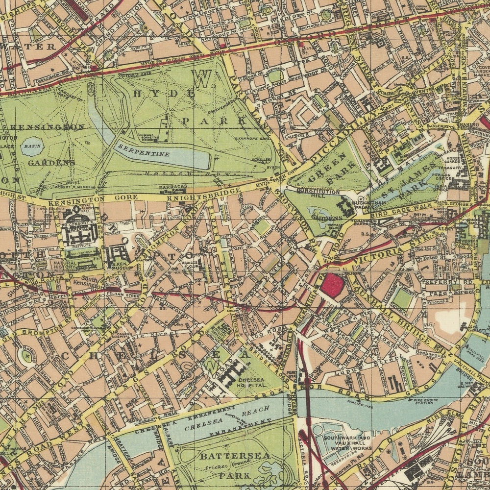 To the east, the City’s tight weave gives way to Shoreditch High Street and Whitechapel Road, the great market and manufacturing corridors leading toward the docks. South of the river—the historic South Bank—a skein of wharves and rail depots lines the Thames, while inland arteries like Wandsworth Road, Brixton Road, and Clapham Road chart the Victorian and Edwardian suburbs that powered London’s daily commute. Chelsea Bridge Road leaps the river to the Chelsea embankment; Fulham Road and Hammersmith Road carry the westward tide through terraces and football grounds toward the upper Thames. The map’s color and labelling bring this industrial-commercial ecology to life, showing how the river, the streets, and the transport lines knit neighborhoods into a single, functioning organism.