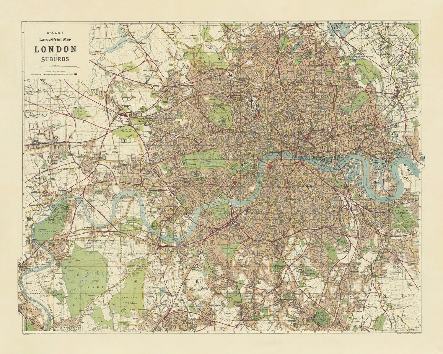 Bacon's Larger-Print Map of London and Suburbs, issued by G. W. Bacon in 1910, is an Edwardian city portrait engineered for absolute clarity. Marked “1 mile” and styled with enlarged lettering, it invites swift orientation across the metropolis and its burgeoning outskirts, with the Thames threaded boldly through the center. Bacon’s hallmark practicality meets elegant color-work to separate districts, parks, and arterial roads at a glance—an urban navigator’s dream at the height of London’s pre-war expansion. Notably, the sheet pushes west to Richmond, a rare breadth for maps of this scale, capturing the frontier where suburbia met river meadows. As a city map, it is compelling for its simultaneity: the historic core, the modern transport age, and the leafier edge of a capital on the move.