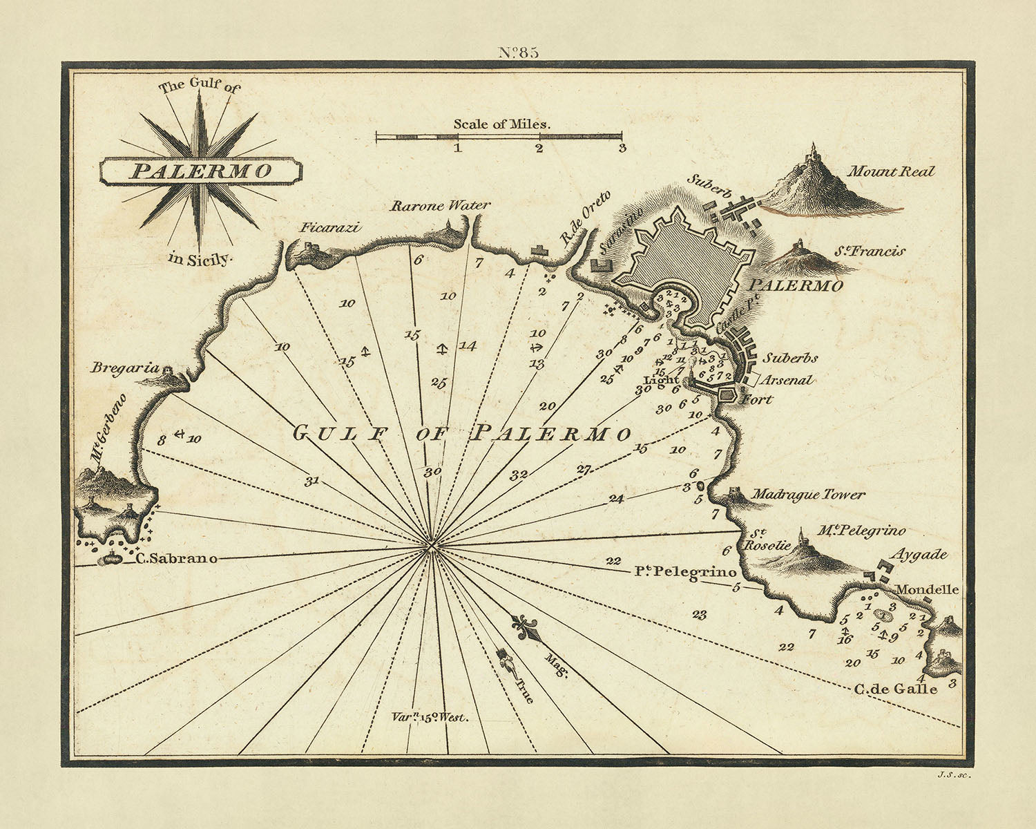 Old Gulf of Palermo, Italy Nautical Chart by Heather, 1802: Monte Pellegrino, Anchorages