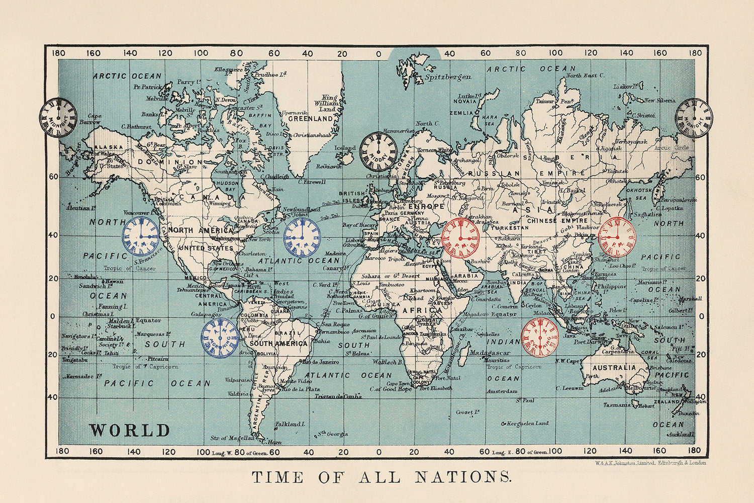 The design of the map is both functional and aesthetically pleasing. The clear delineation of continents, countries, and major cities, along with the precise grid system of latitude and longitude, makes it easy to locate specific places. The clocks indicating local times in various regions add a dynamic element to the map, making it not just a static representation of the world but a living document that reflects the movement of time. The map also includes annotations with colonial names, offering a glimpse into the geopolitical context of the era.