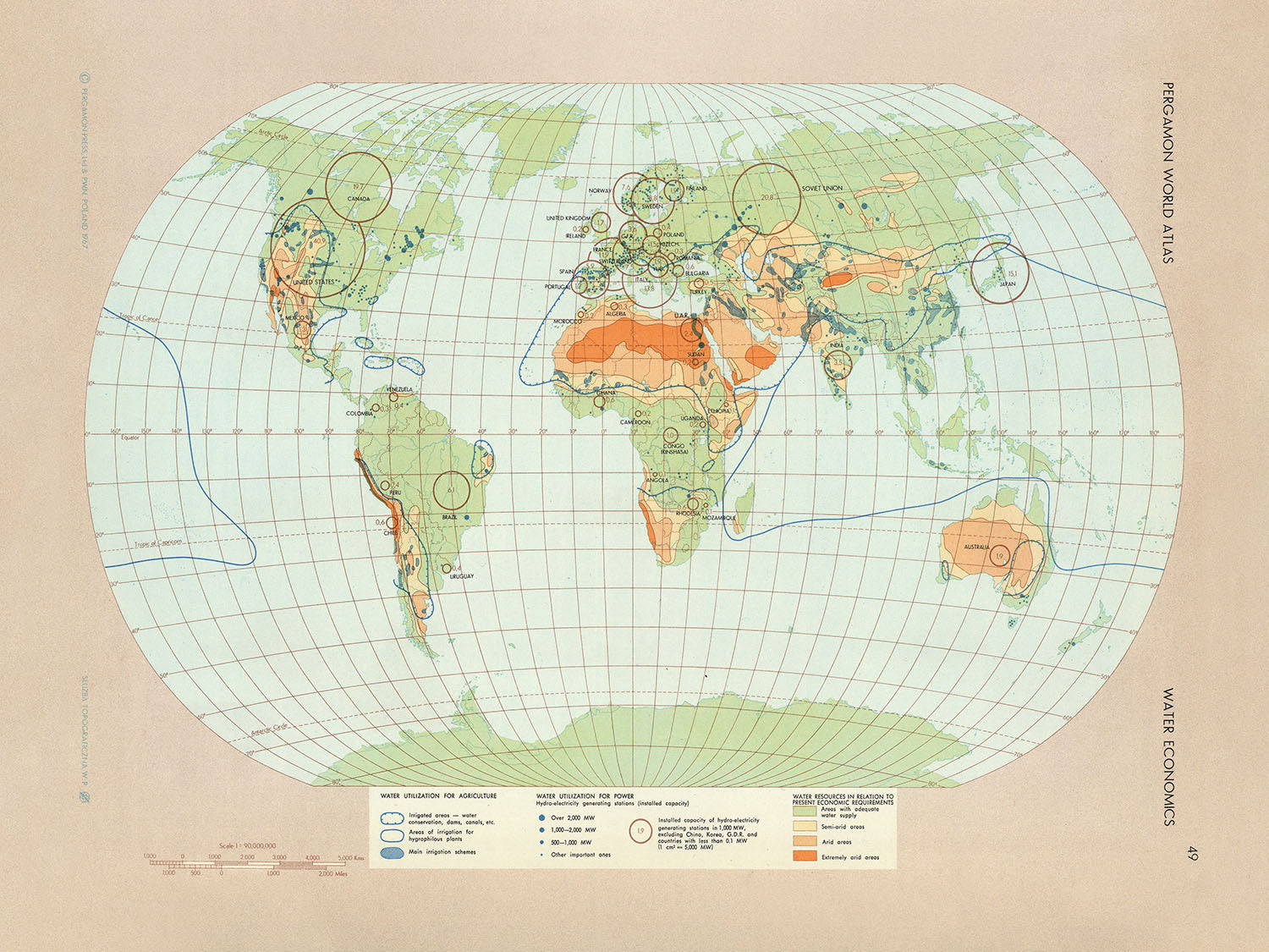 This 1967 World Water Economics map, published by the Polish Army Topography Service, is a fascinating look at water utilization for agriculture and power, as well as general water availability compared with aridity. It shows the world's major rivers, lakes, and oceans.
