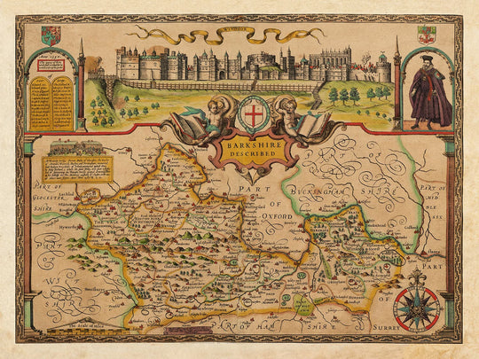 Many of the towns, villages and cities in Berkshire are already visible in this ancient map, such as Newbury and Reading. But centre stage goes to Windsor - and indeed, the entire top of the map is dominated by a lovely landscape of Windsor Castle.