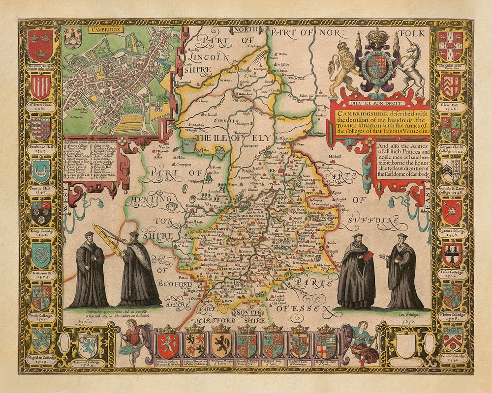 Many of the towns, villages and cities in Cambridgeshire are already visible in this ancient map. But obviously, the university city of Cambridge takes centre stage, with a beautifully detailed engraving in the top left corner of the map.