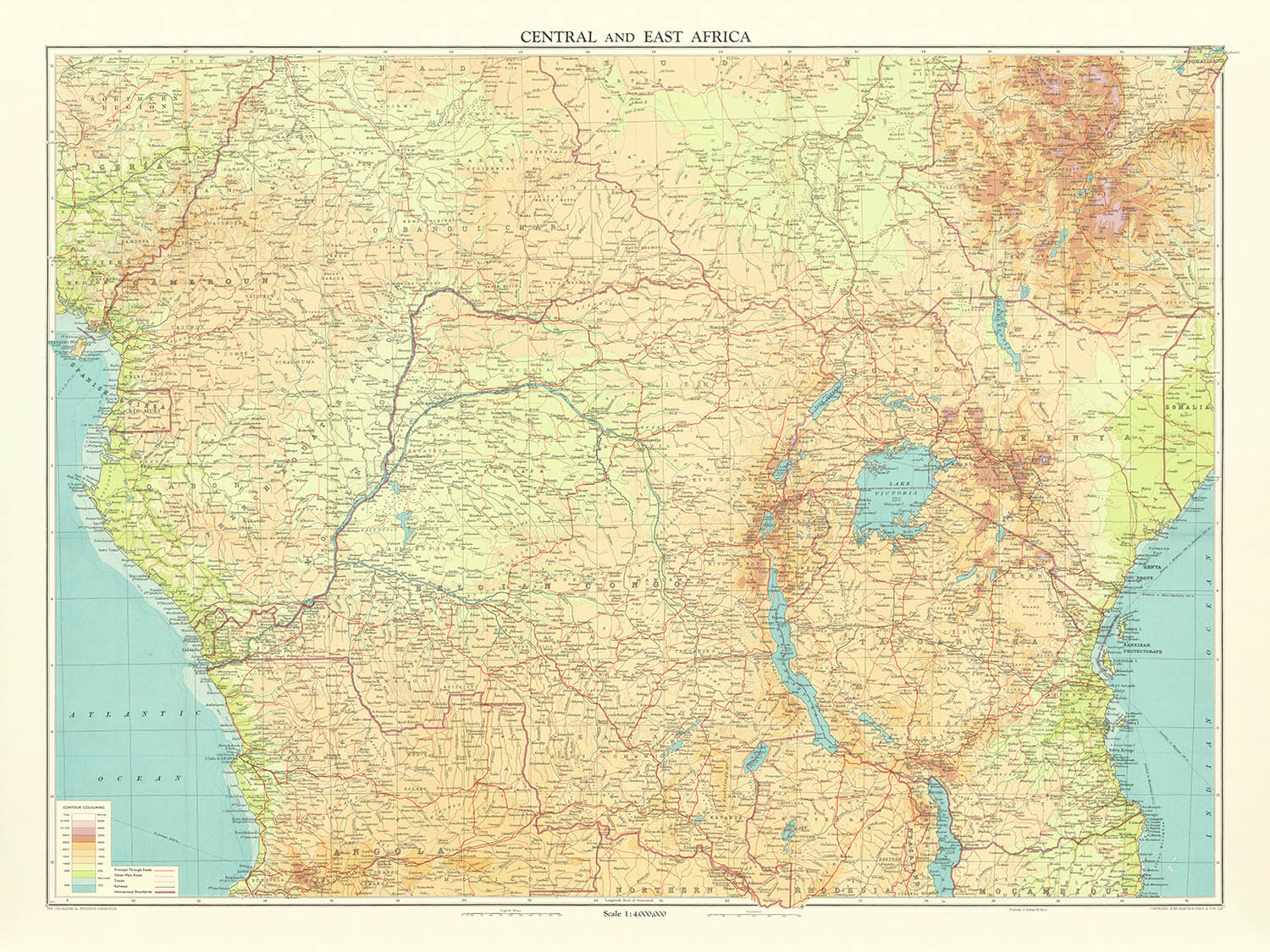 Central and East Africa (1922) by John Bartholomew is a lucid portrait of a continent in transition at the dawn of the interwar era. Created by one of Britain’s most exacting cartographers, it gathers an immense sweep of territory—Tanganyika Territory, Ruanda‑Urundi, British East Africa (Kenya), Uganda, Belgian Congo, Angola, and Northern Rhodesia—into a disciplined composition at 1:4,000,000. Bartholomew deploys hypsometric tints to translate relief into color, carrying the eye from green lowlands to purple‑brown highlands and immediately clarifying the relationship between terrain, watersheds, and settlement. Political boundaries are drawn with unmistakable precision, yet never overwhelm the geography; the result is a map that balances authority with readability, capturing the administrative order and natural structure of Africa’s midsection in 1922.