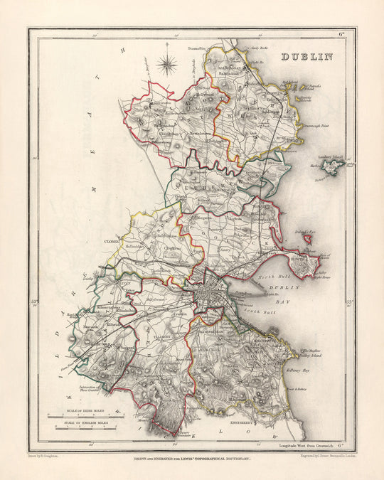 Featuring the expert cartography of Samuel Lewis, this map presents a unique perspective of County Dublin during the mid-19th century. It offers a fascinating snapshot of the area's main towns, cities, and other interesting features, excluding Dublin itself. Please note that some modern cities may not be depicted on this map, while others may appear under earlier names, adding an exciting element of discovery.